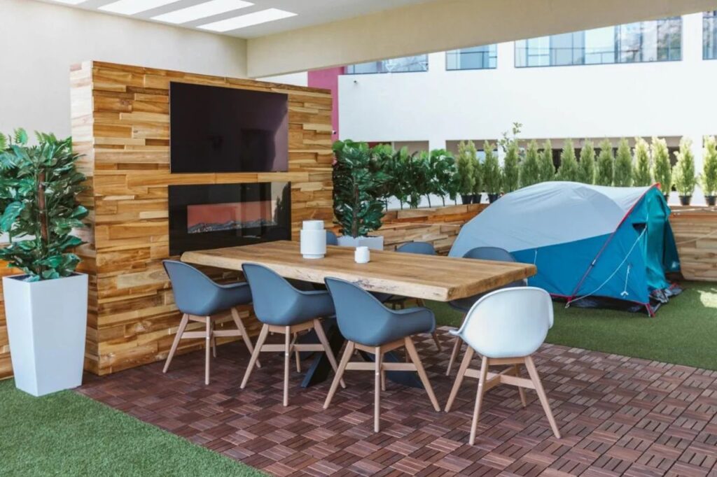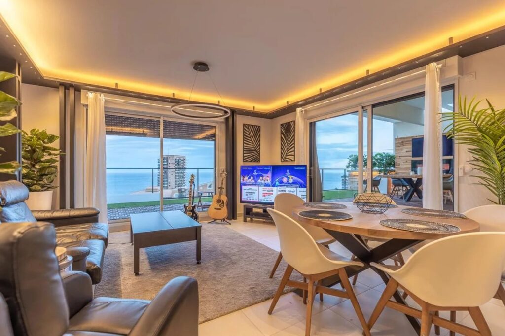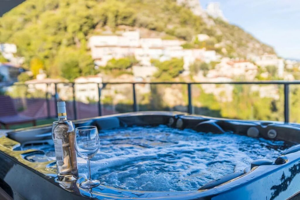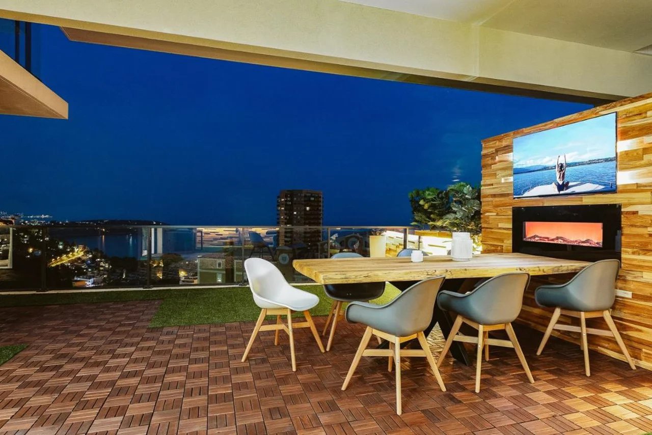 This property features a spacious terrace of 96 m² with panoramic views, complemented by a private jacuzzi, an outdoor dining area with heating, and a television.
