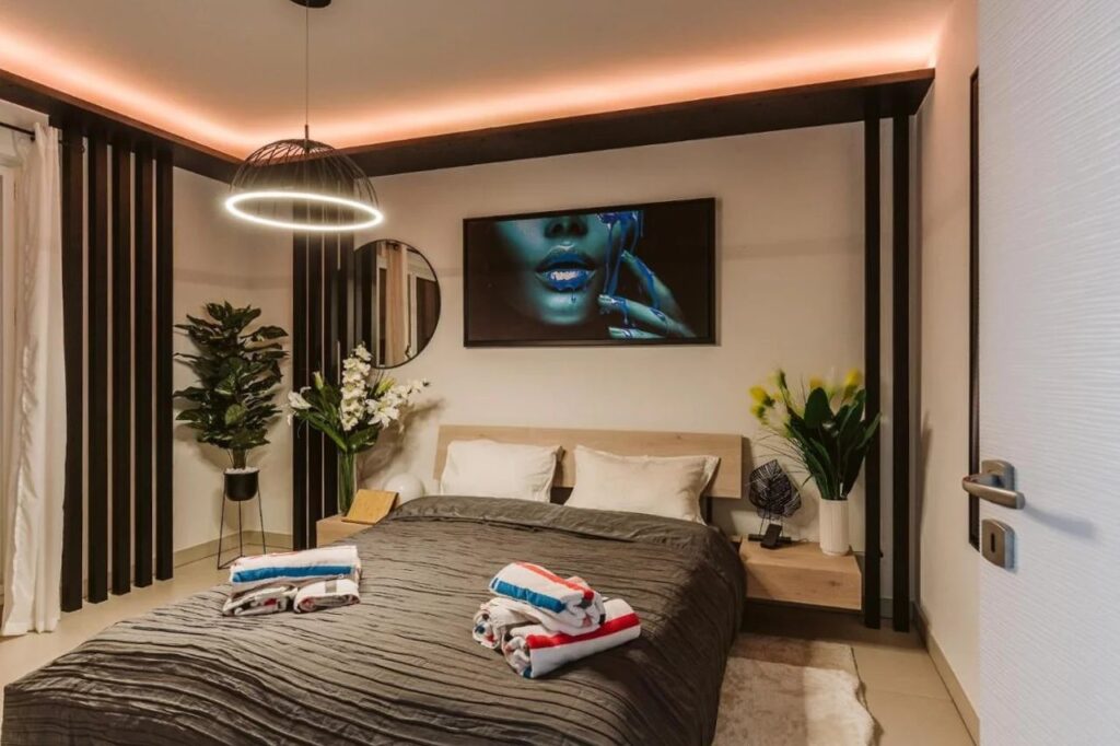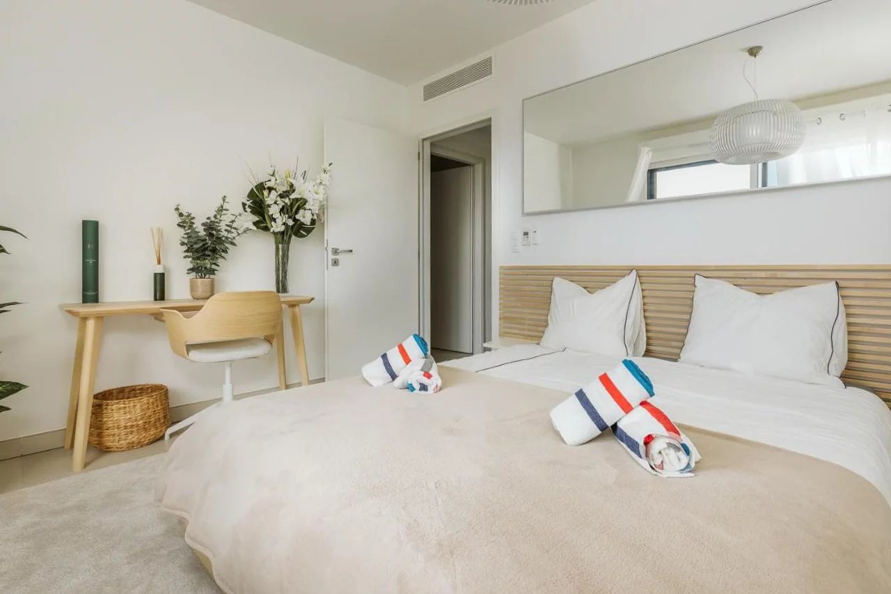 The residence was completed in 2017, includes a concierge, and boasts a rooftop pool with panoramic sea views.