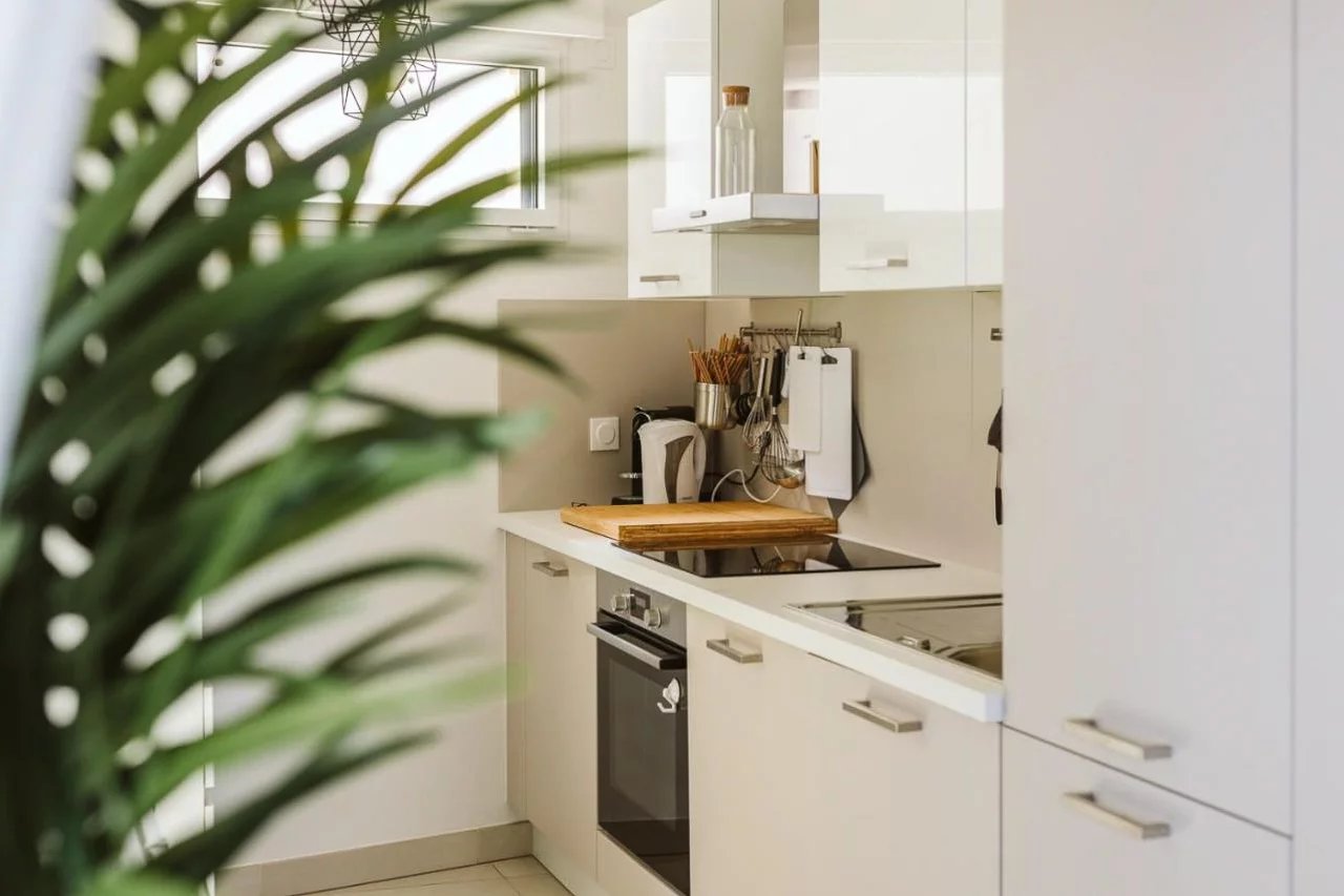 Inside is an electronic entry door with a keypad, a living room and dining area both opening onto the terrace, and a fully equipped american kitchen. Two bedrooms also open onto the terrace.