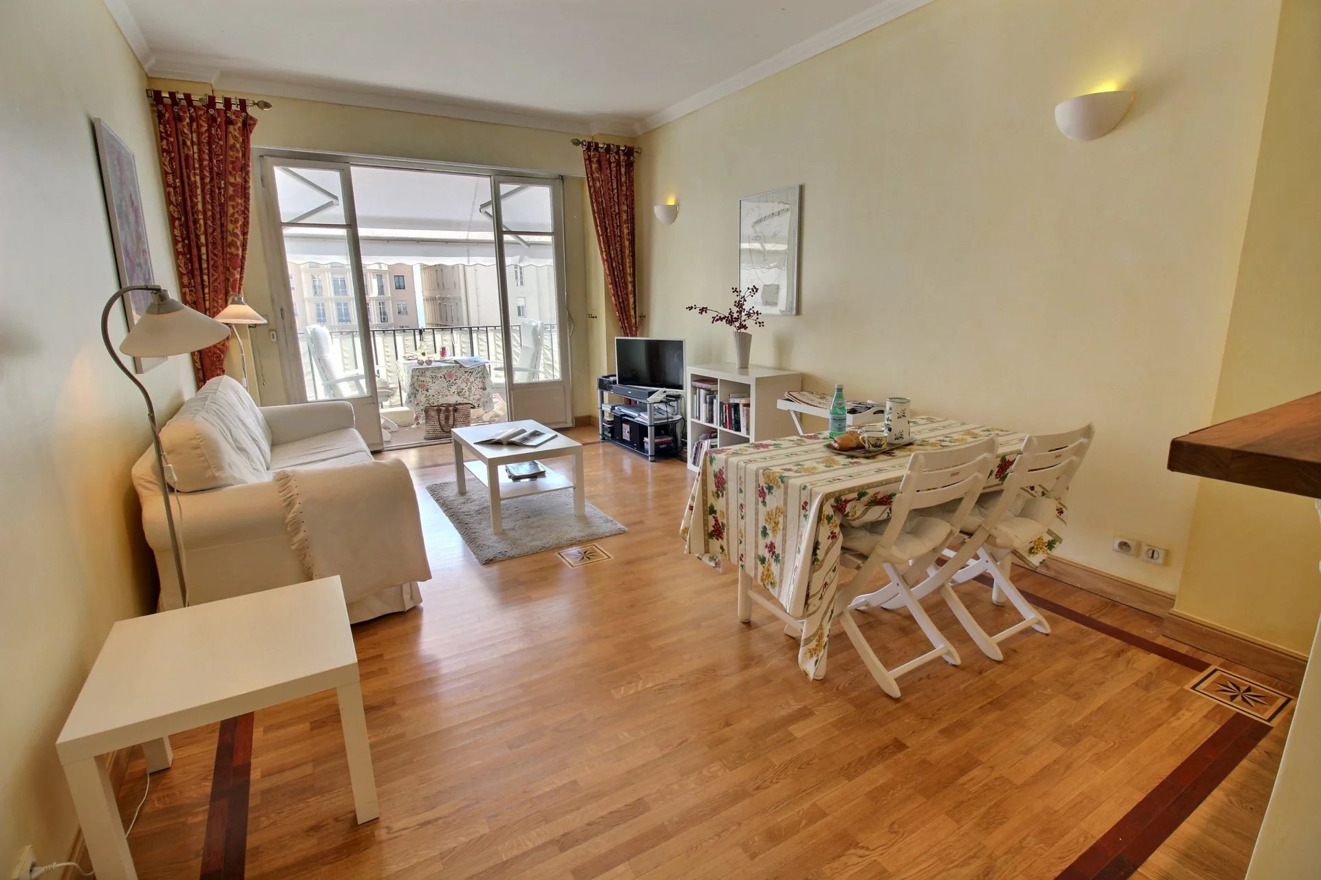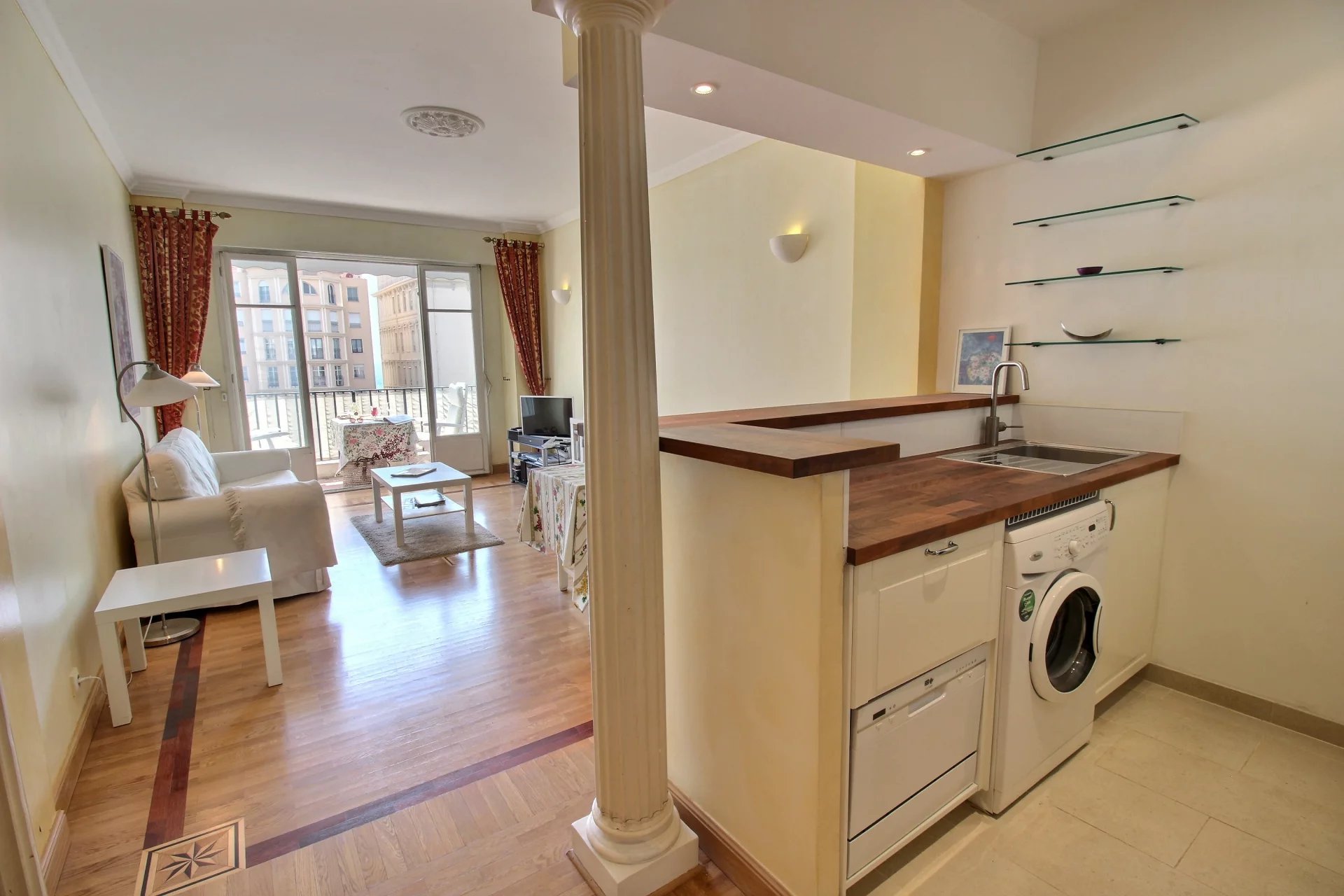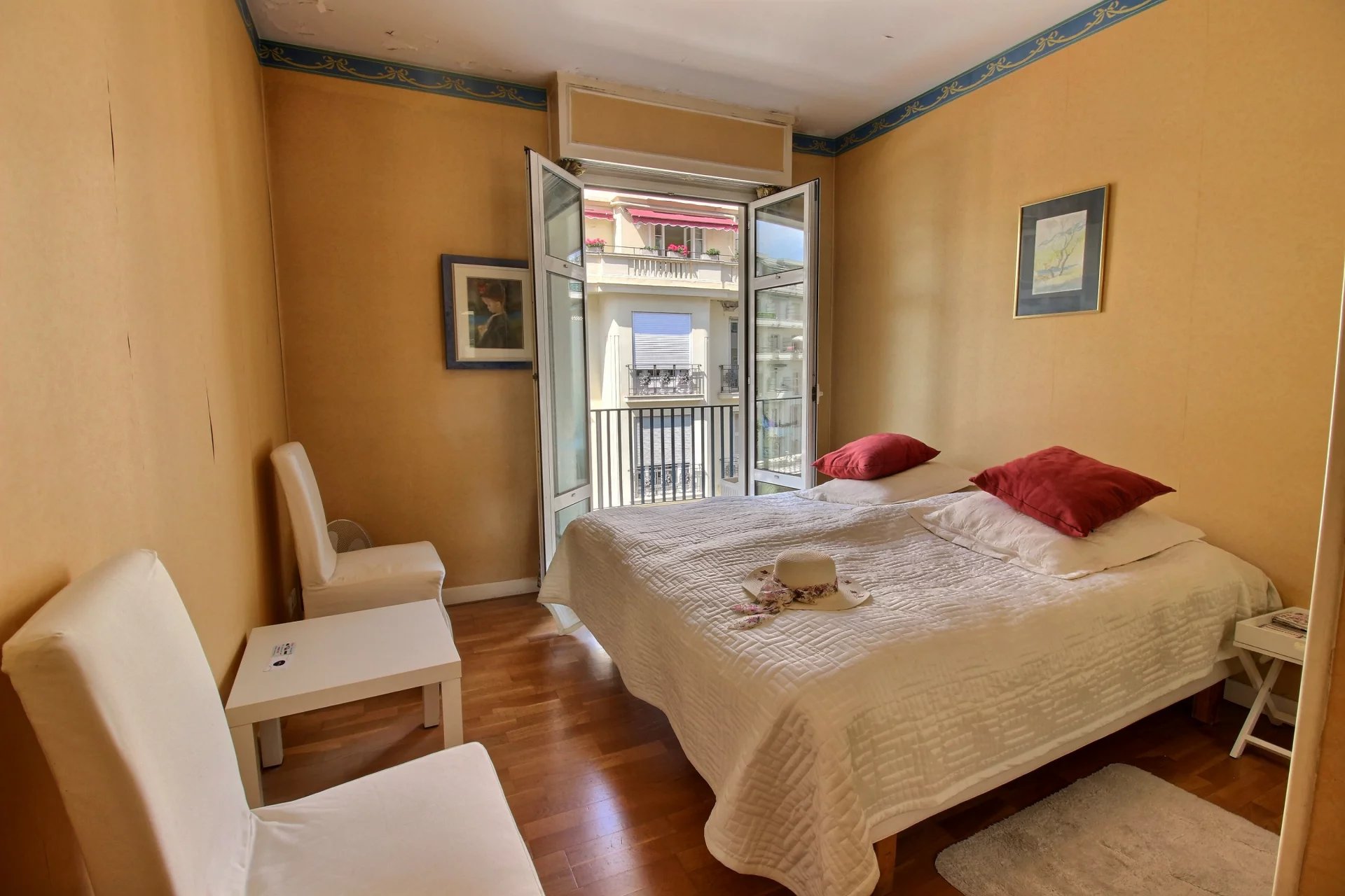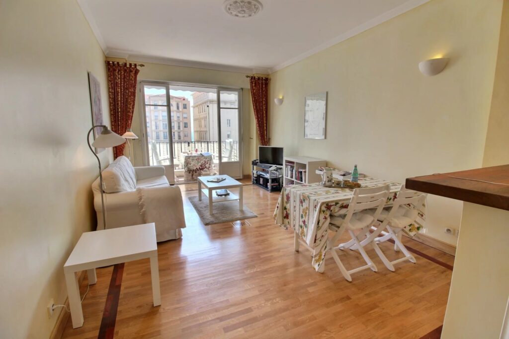 The flat comprises an entrance hall, a bright living room with open-plan kitchen opening onto a terrace with views of the sea and the Negresco. The quiet night area comprises two bedrooms opening onto a balcony, a bathroom and separate WC.