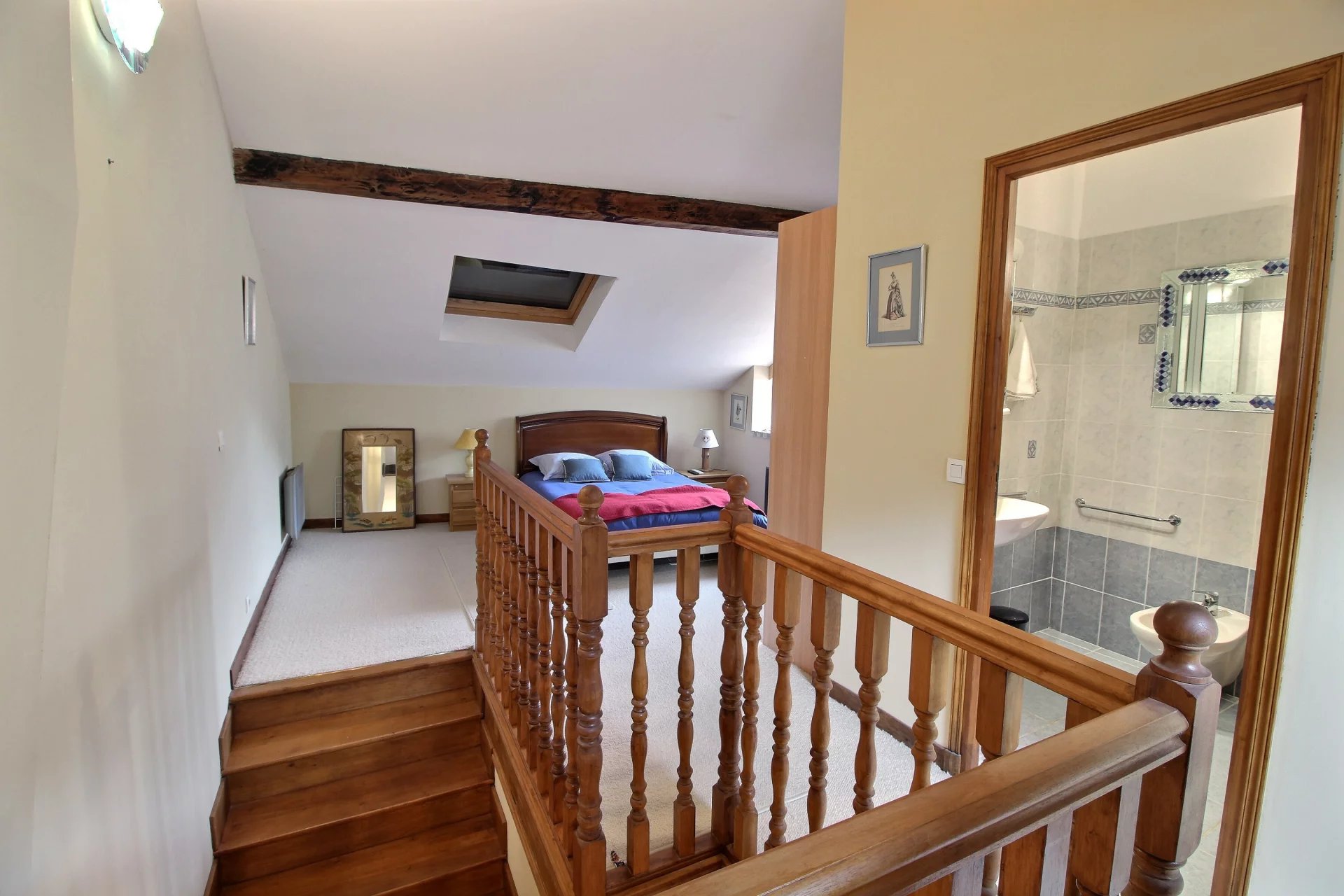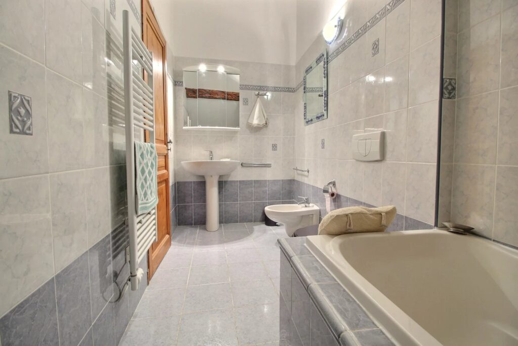 The second floor offers a bedroom with storage space and access to a balcony, along with a large bathroom featuring a bathtub, shower, double sink and WC. On the top floor, you'll find a second bedroom and an additional bathroom with a bathtub and WC.