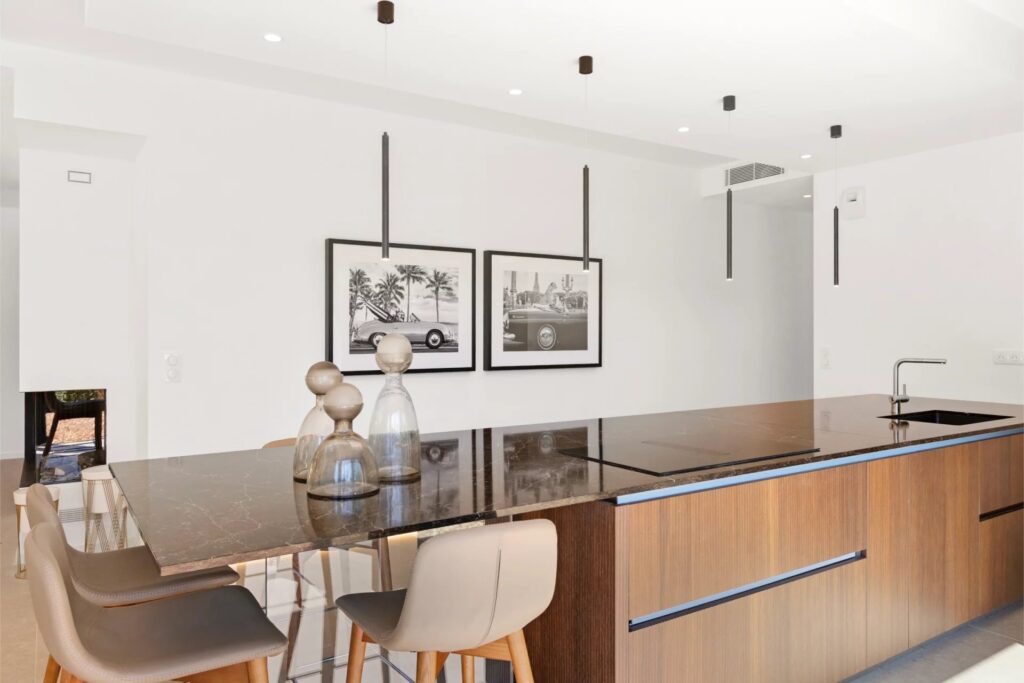 The contemporary villa “Augusta” is a stunning newly completed property offering 240 m² of refined comfort. Spread over two levels, it features a light-filled entrance, a spacious living room with fireplace, a fully equipped open-plan kitchen, and a master suite with en-suite bathroom and walk-in closet on the ground floor. Upstairs, three additional bedrooms each come with their own private bathrooms.