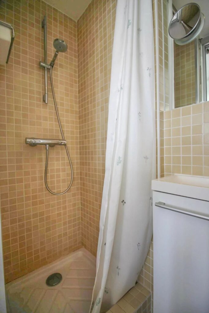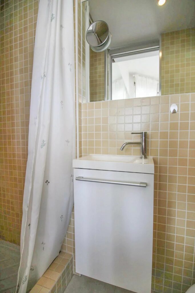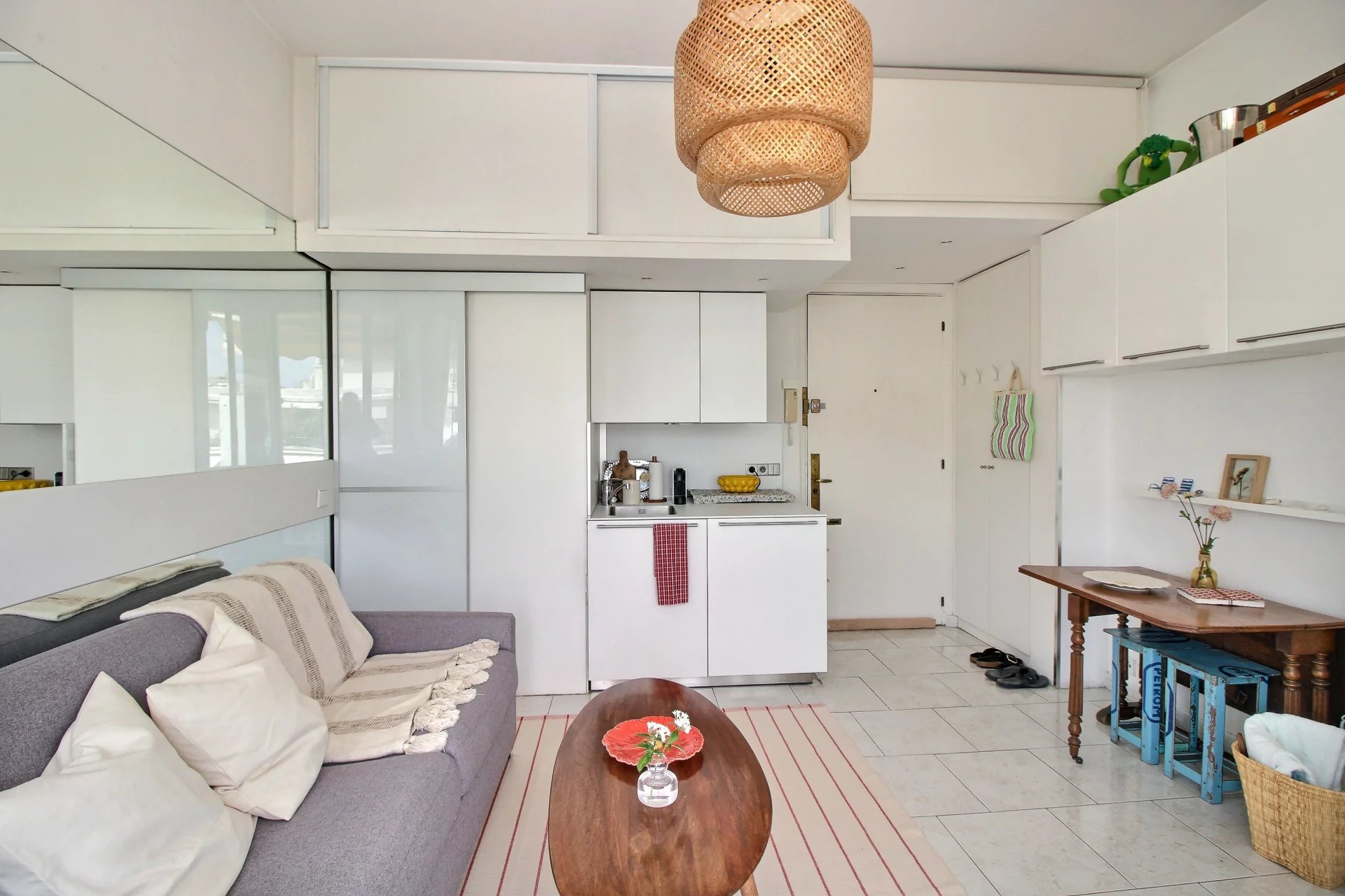 Situated on the 5th floor of a building with elevator, the studio features a bright living area with an open kitchen and ample built-in storage. The room opens onto the sunny terrace of approximately 10 m2 – an inviting space to relax or entertain. You will also find a shower room with toilet.