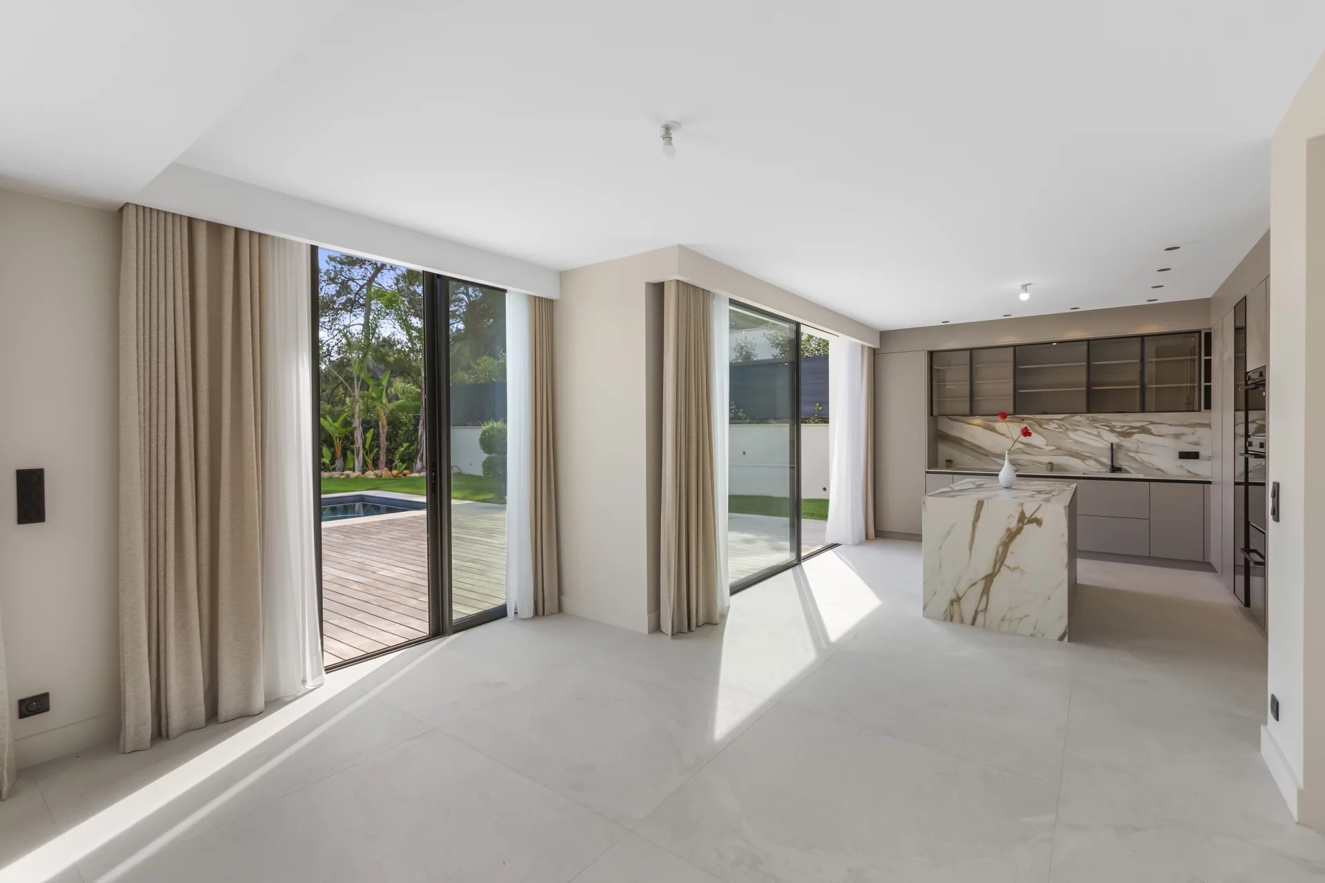 Upon entering, a spacious and bright living room opens onto a superb kitchen. Large bay windows extend the living space onto a wooden terrace and a stunning swimming pool.