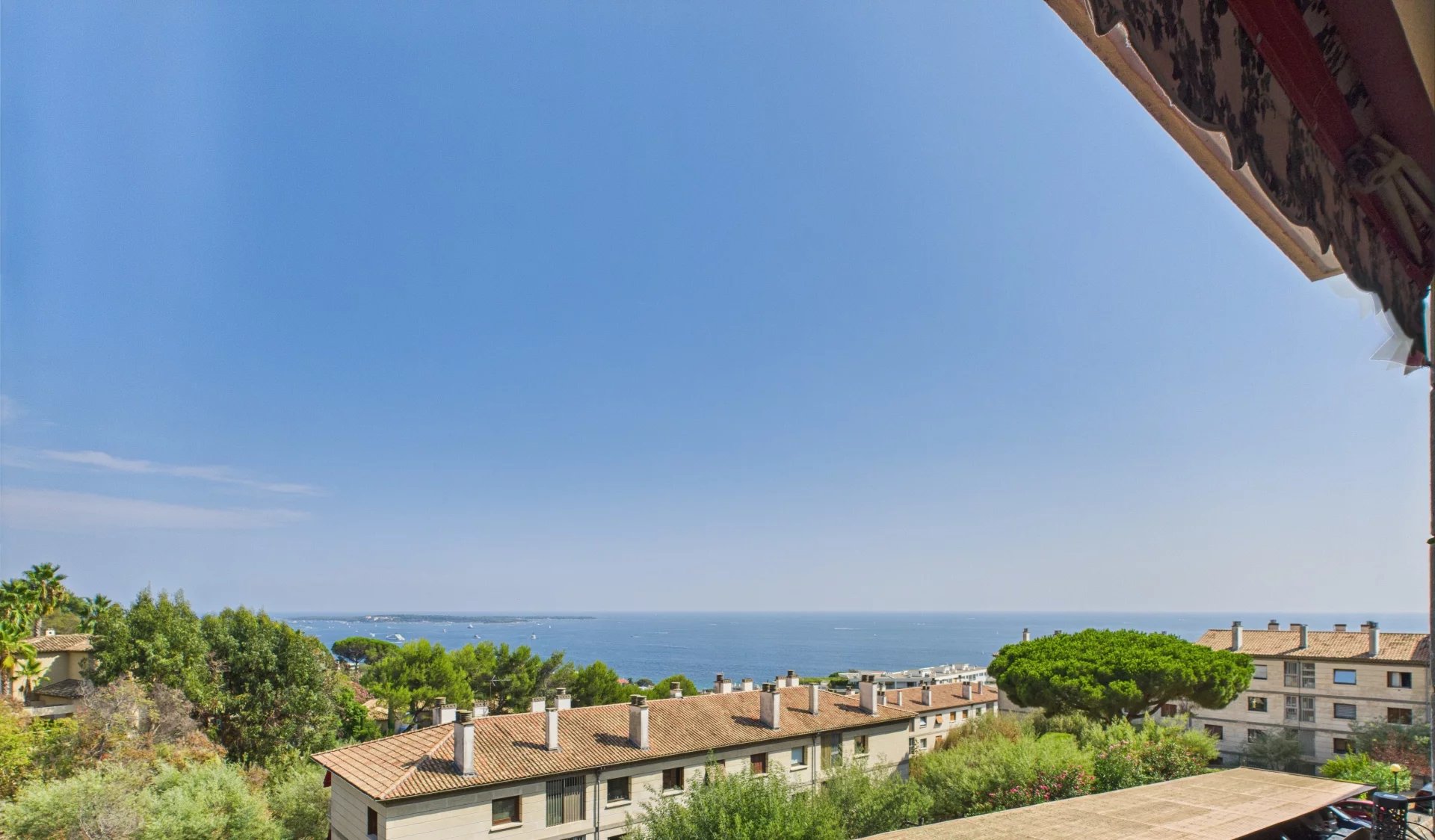 As soon as you enter, you will be charmed by the inevitably, light-filled living space, where the living room and dining room open naturally onto a terrace offering an exceptional panorama: an unobstructed view of the Mediterranean and the Lérins Islands, enhanced by lush greenery.