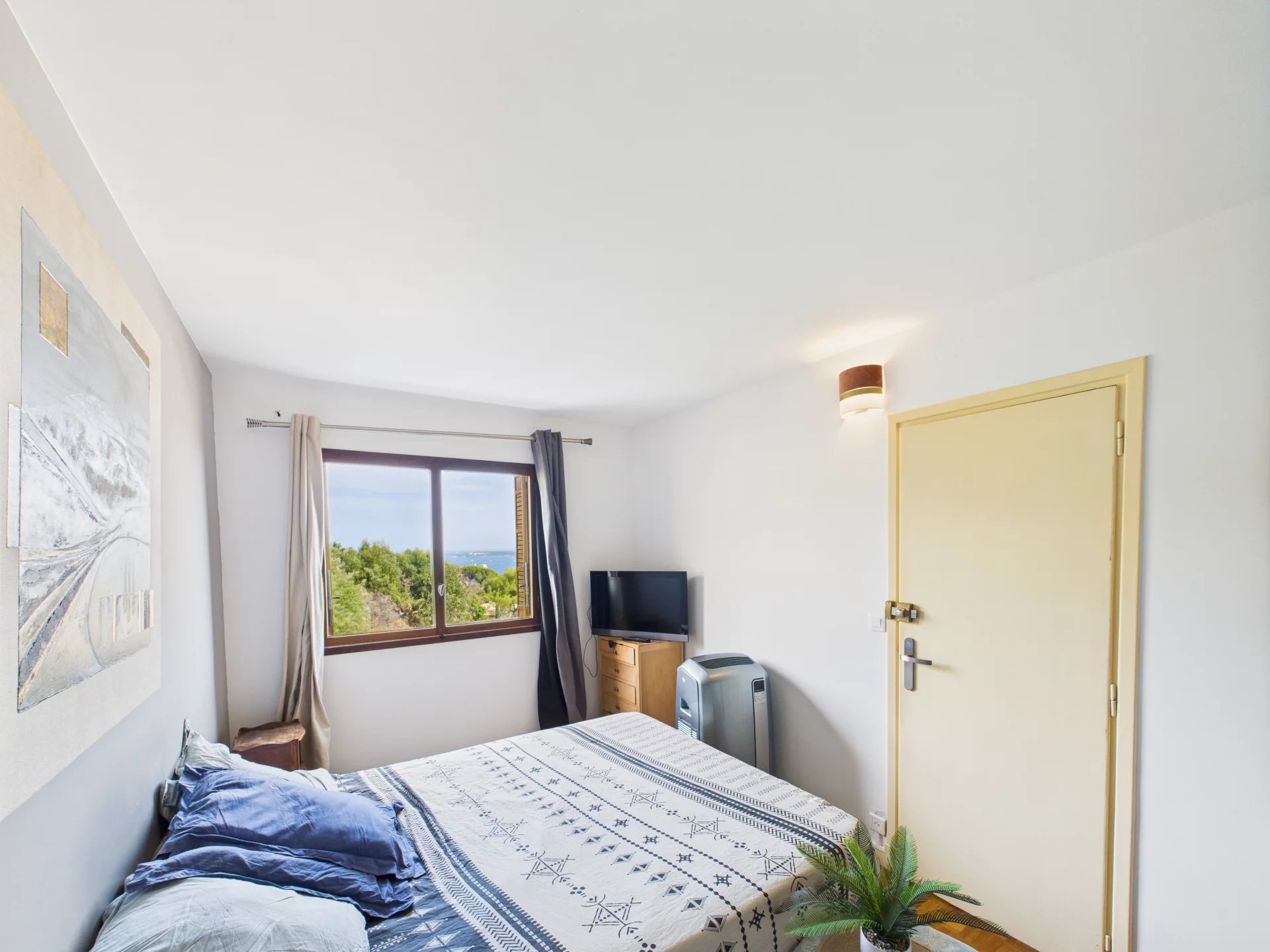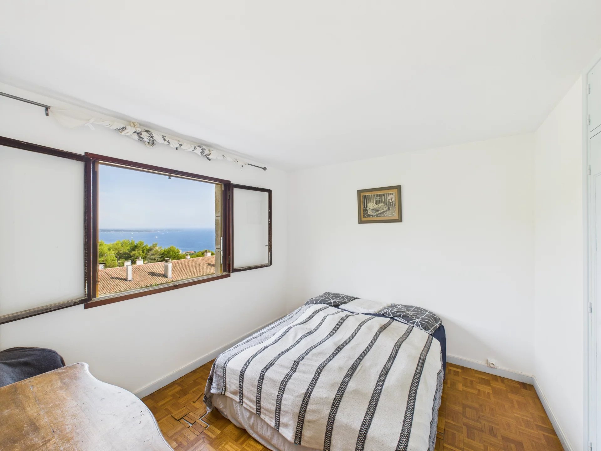 The sleeping area is a cocoon of serenity: three comfortable bedrooms with built-in closets, two of which offer a postcard-perfect view of the sea. A large bathroom with toilet completes the ensemble.