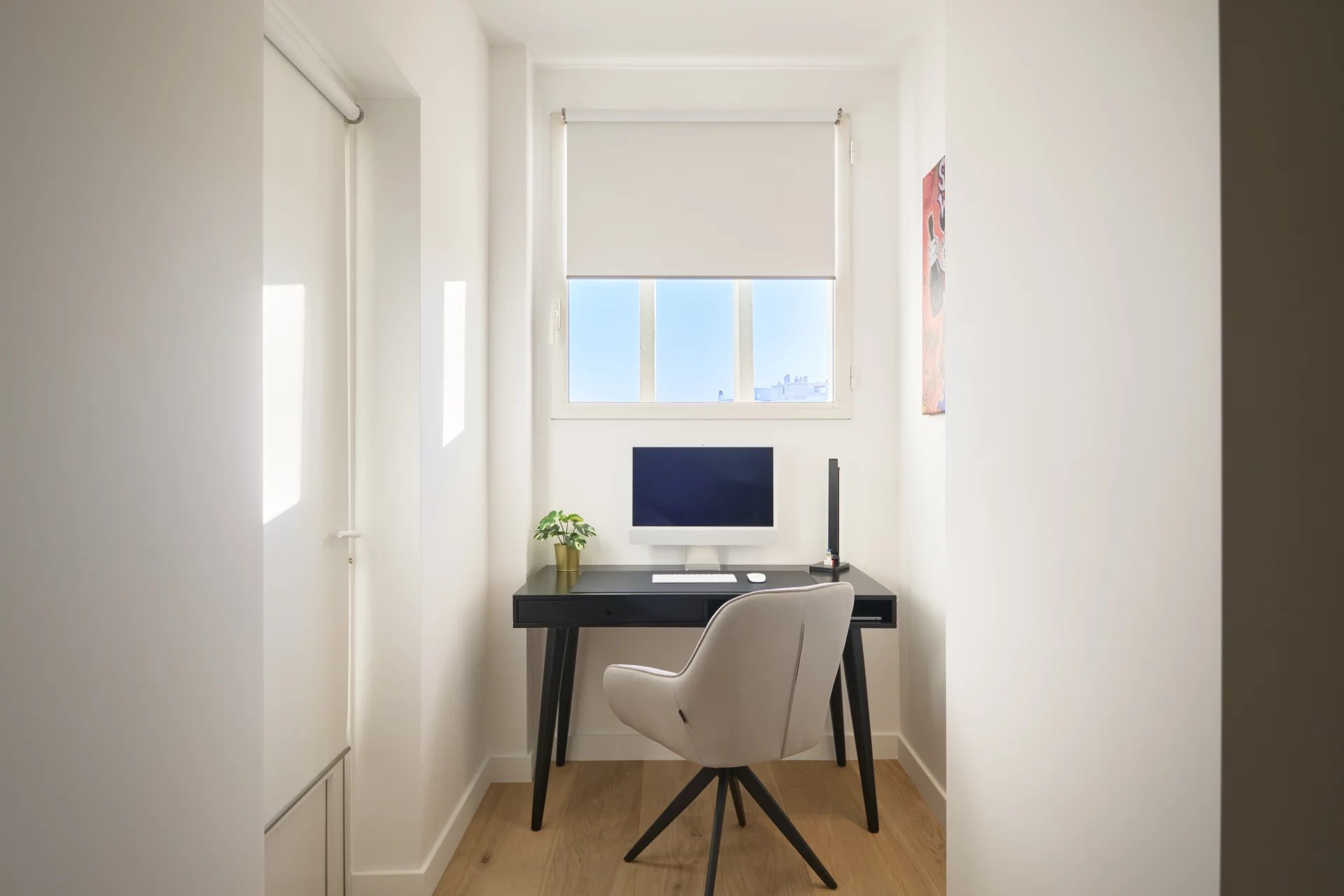 The apartment consists of an entrance hall, a bright living room with a fully equipped open-plan kitchen featuring high-end appliances, an independent WC, and a bedroom with custom-made Italian dressing including LED lighting, as well as an en-suite bathroom. Large bay windows flood the interior with natural light and extend the living space onto the terrace, creating an ideal setting for relaxation.