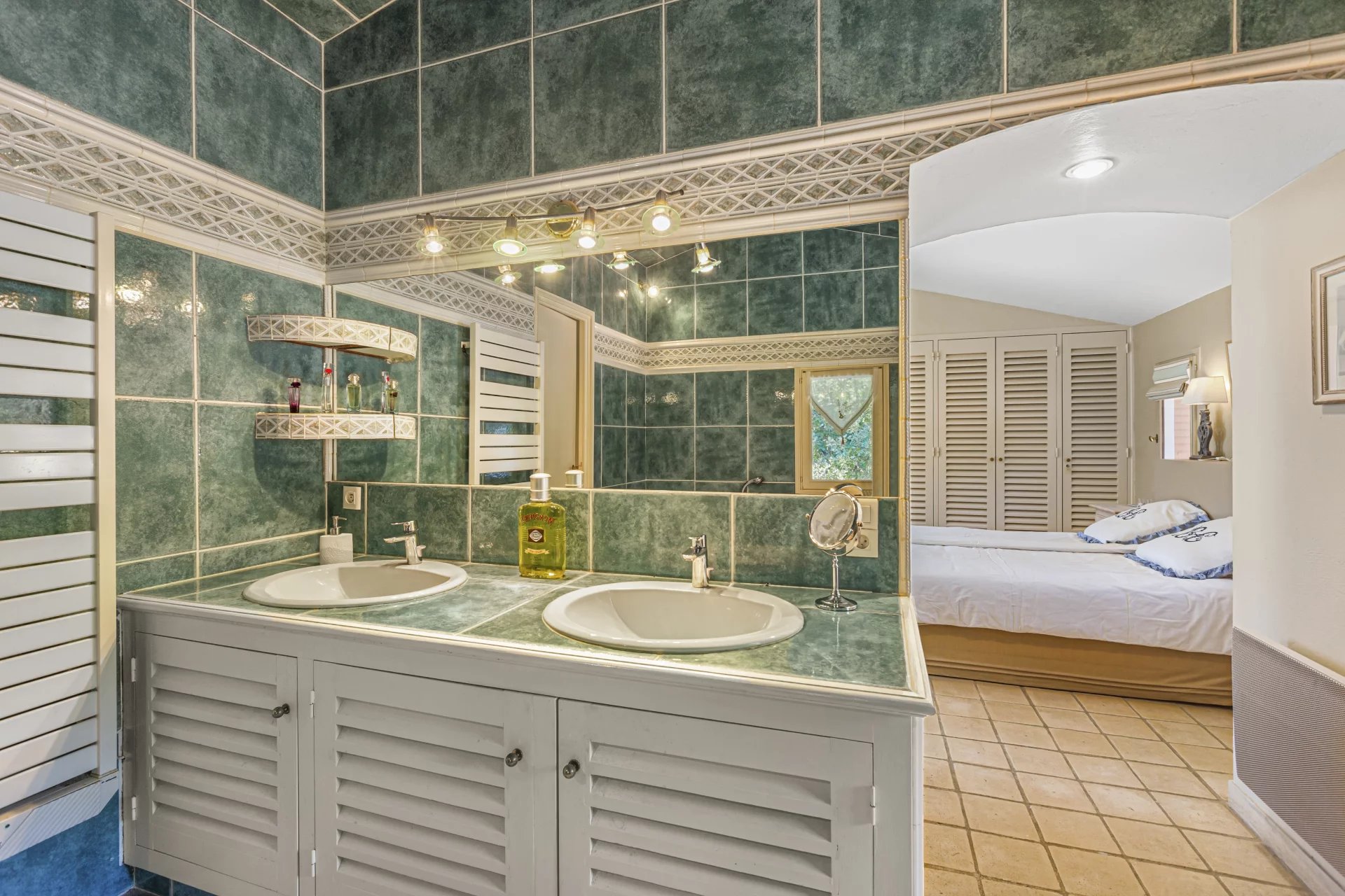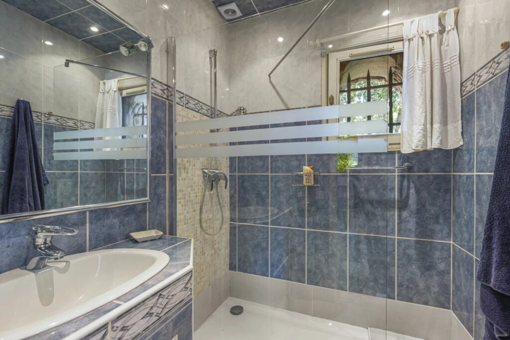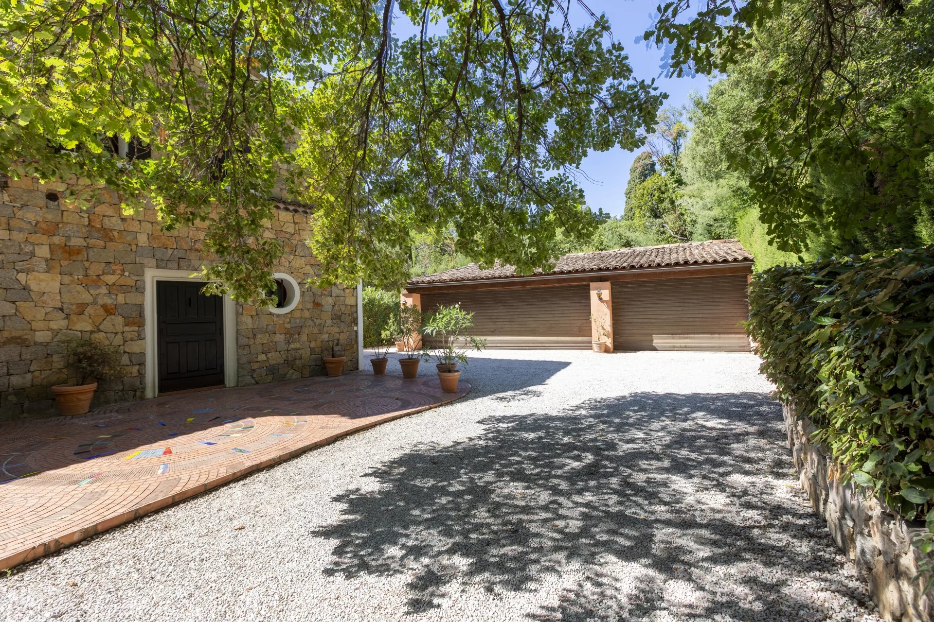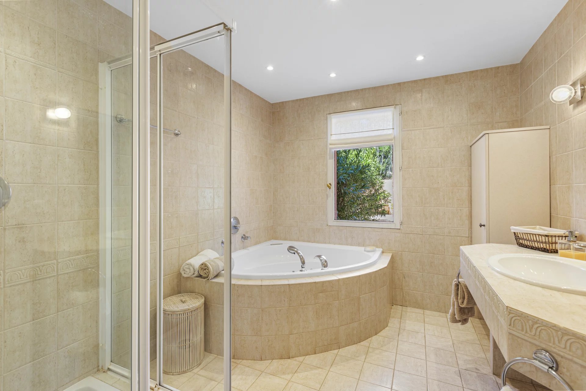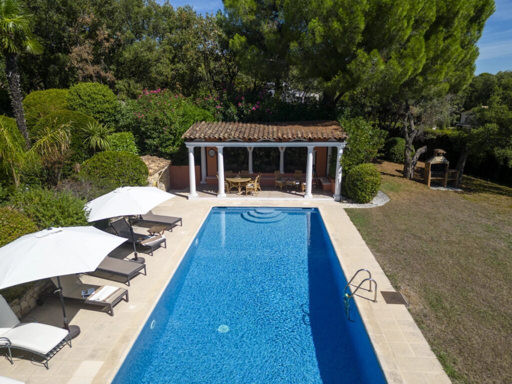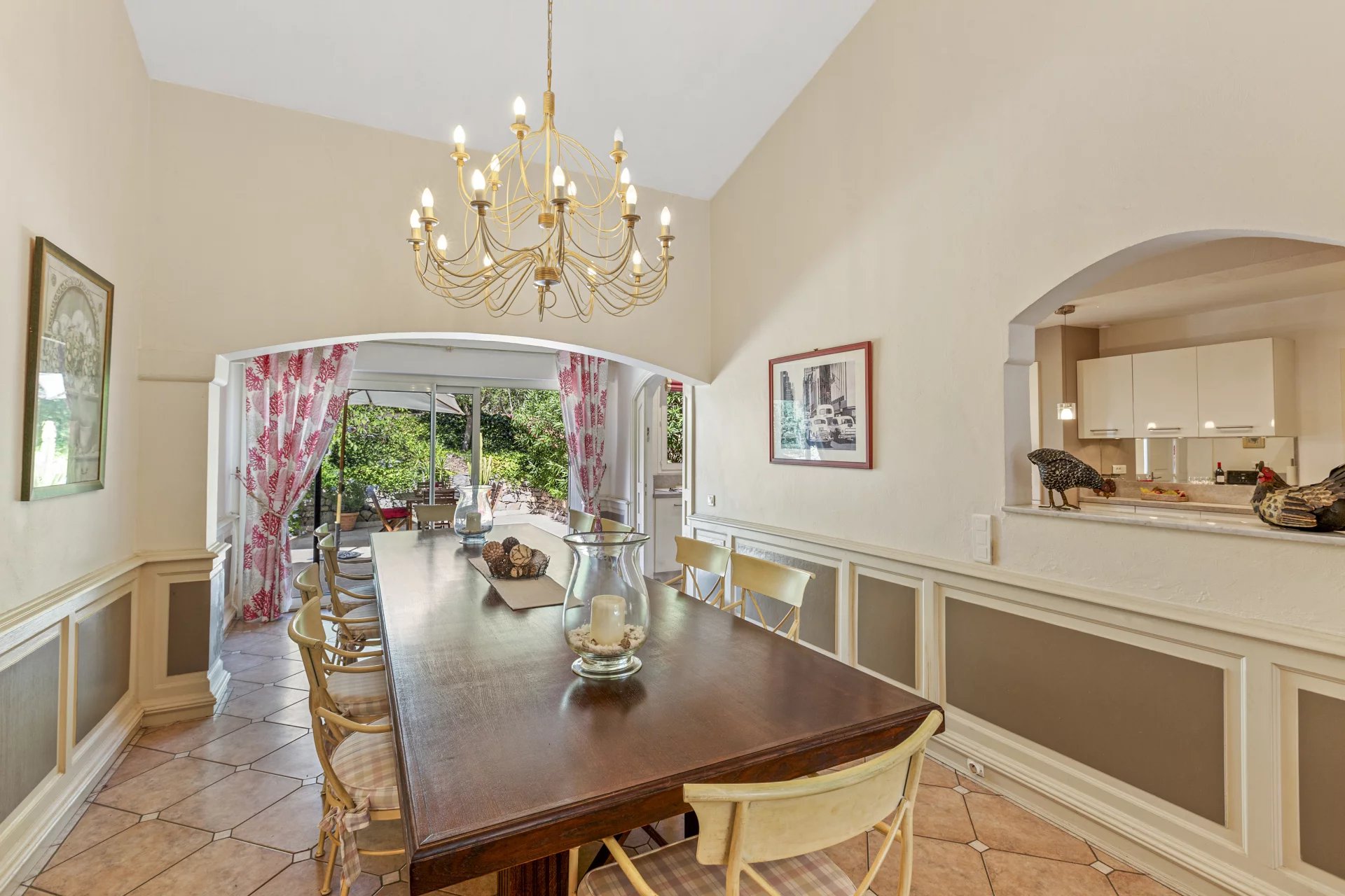 Very well kept house with double garage for 5 cars. Big flat garden with proper pool area, boule court and a tennis court. Absolutely calmness. 10 minutes from Mougins, on the limit in between Auribeau and Pégomas. Inside the house you find everything on ground floor except the parental ensuite which is situated on first floor. Living room and dining room all together with the kitchen a bit separated but can be open towards the dining area. Big fireplace.