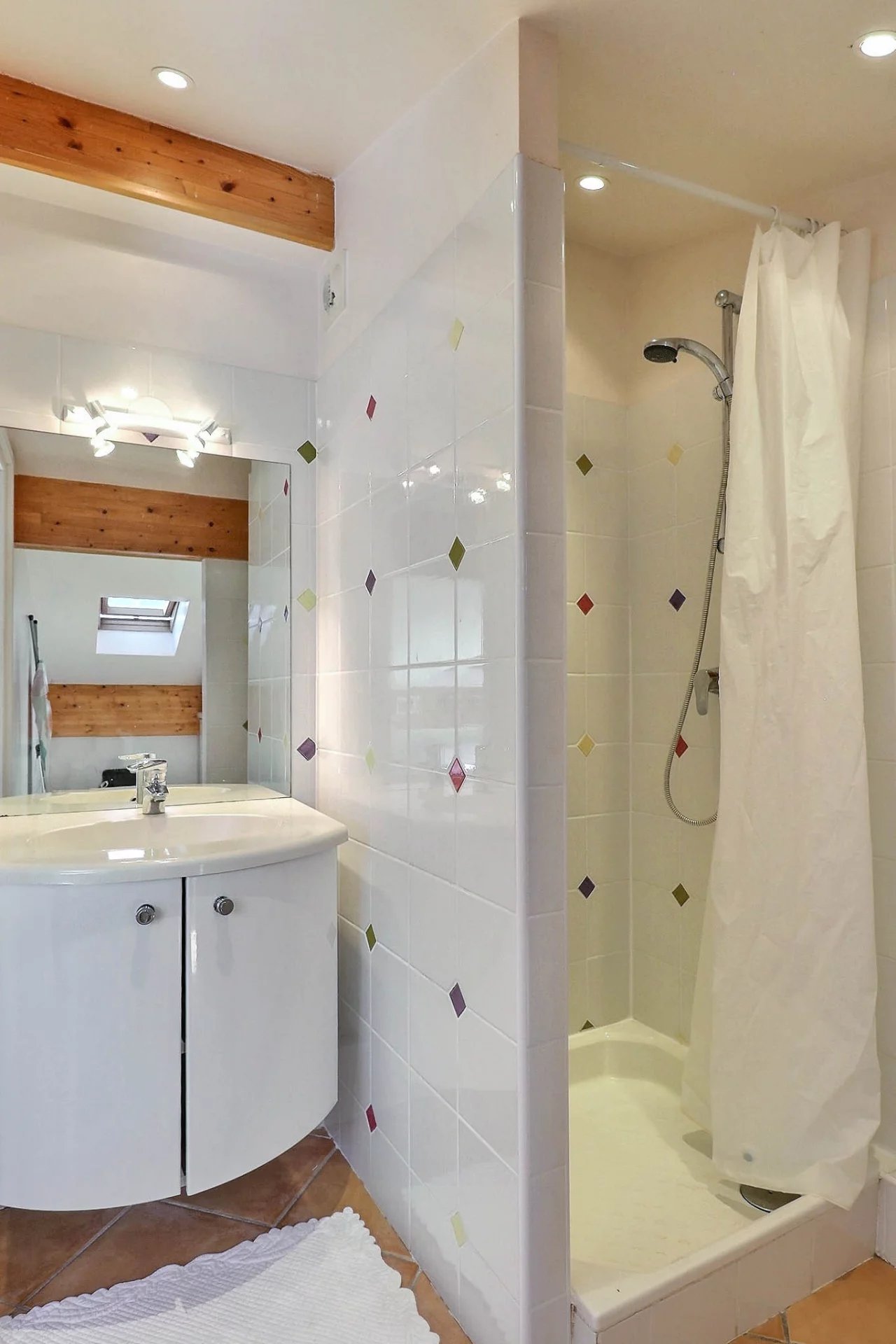 It comprises an entrance leading to a bright living room with a kitchen, terrace, and guest toilet. Upstairs, you will find two bedrooms, each with its own bathroom, as well as a laundry room.