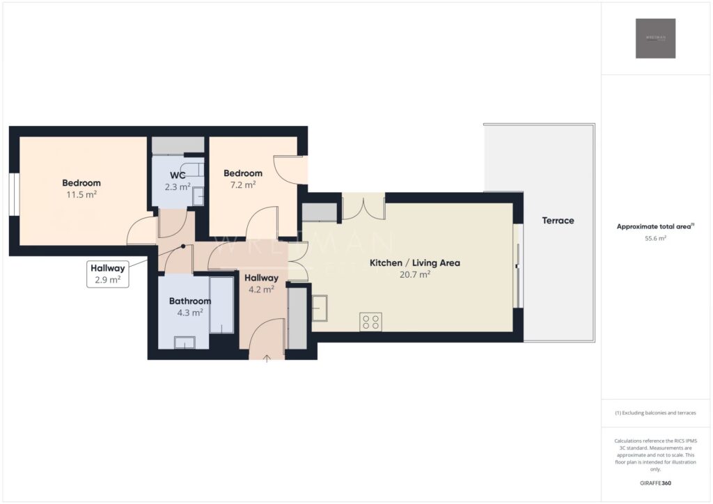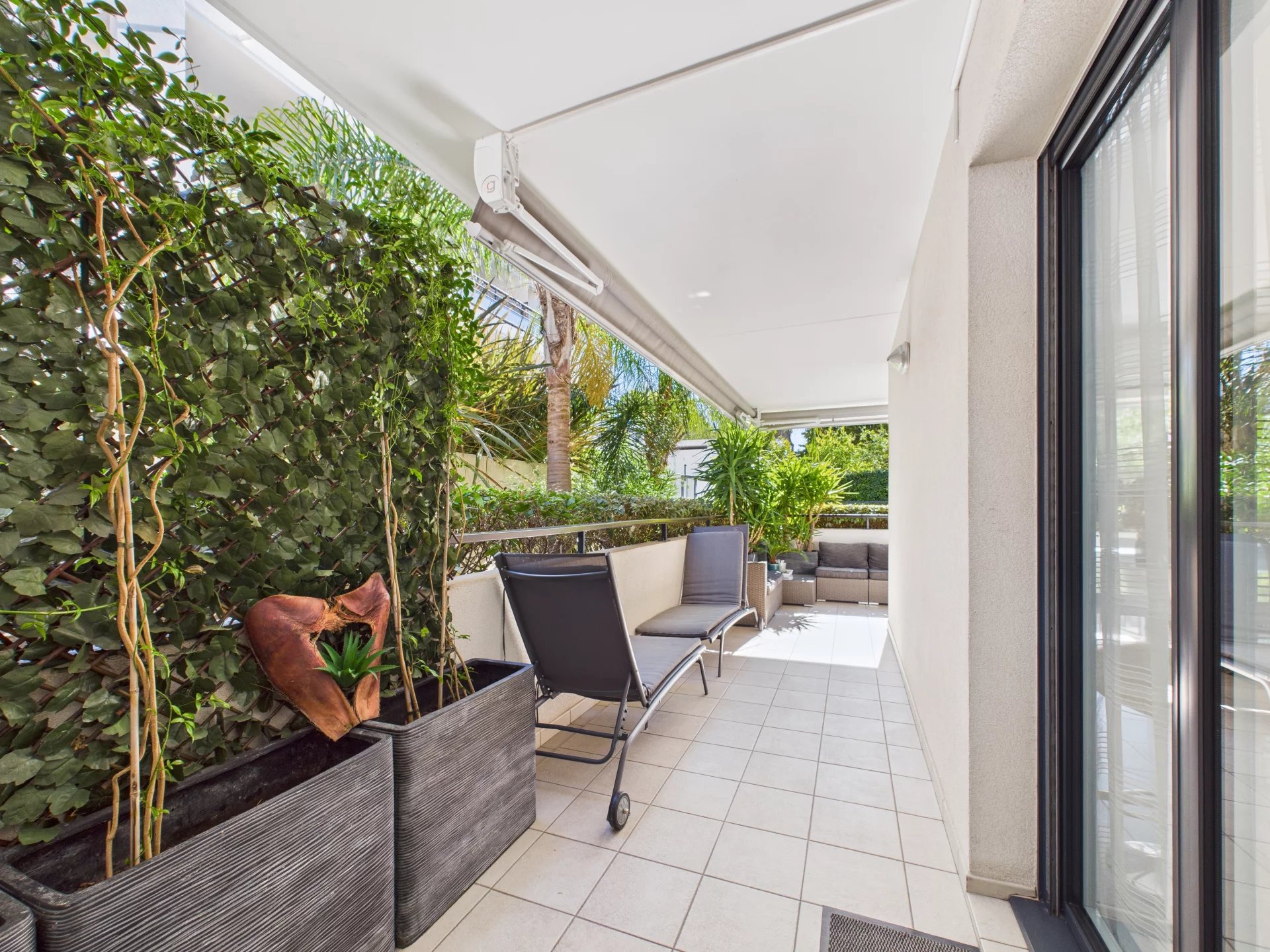 I stueetagen, består denne lyse lejlighed af en lys stue med et fuldt udstyret og udstyret åbent køkken, to soveværelser, et badeværelse og et separat toilet. Stuen åbner ud til en 22 m² hjørneterrasse, der vender mod syd og øst, med elektriske markiser og uhindret udsigt.