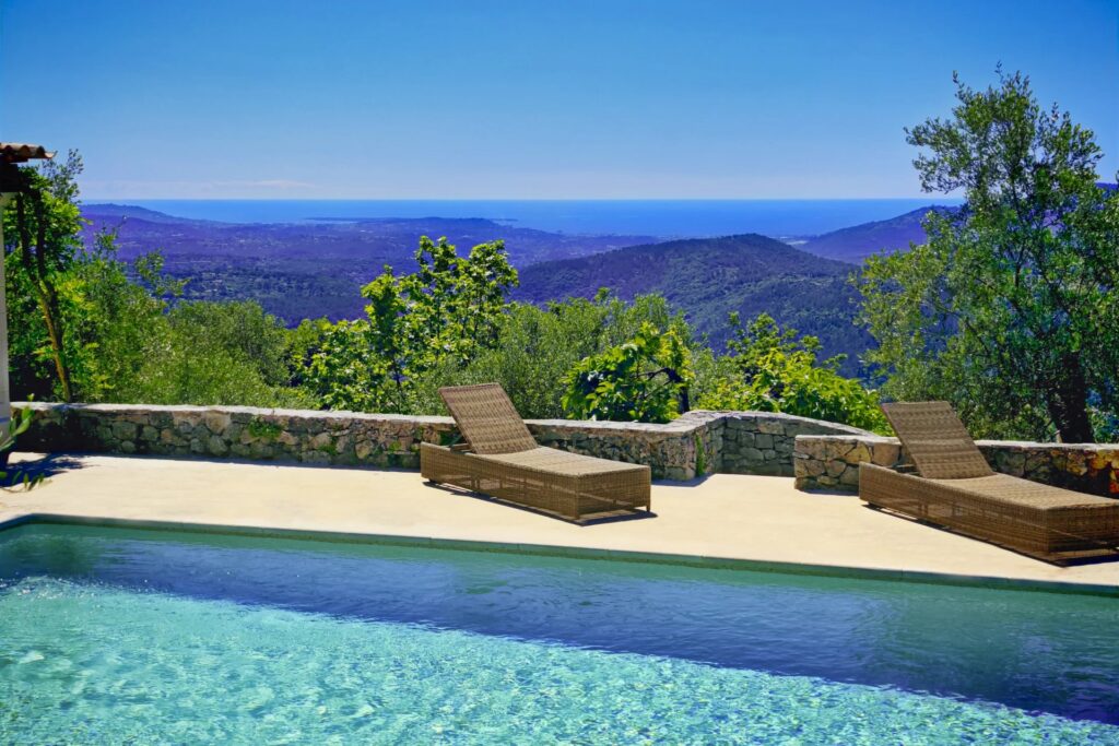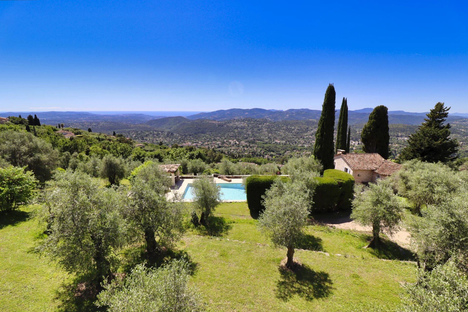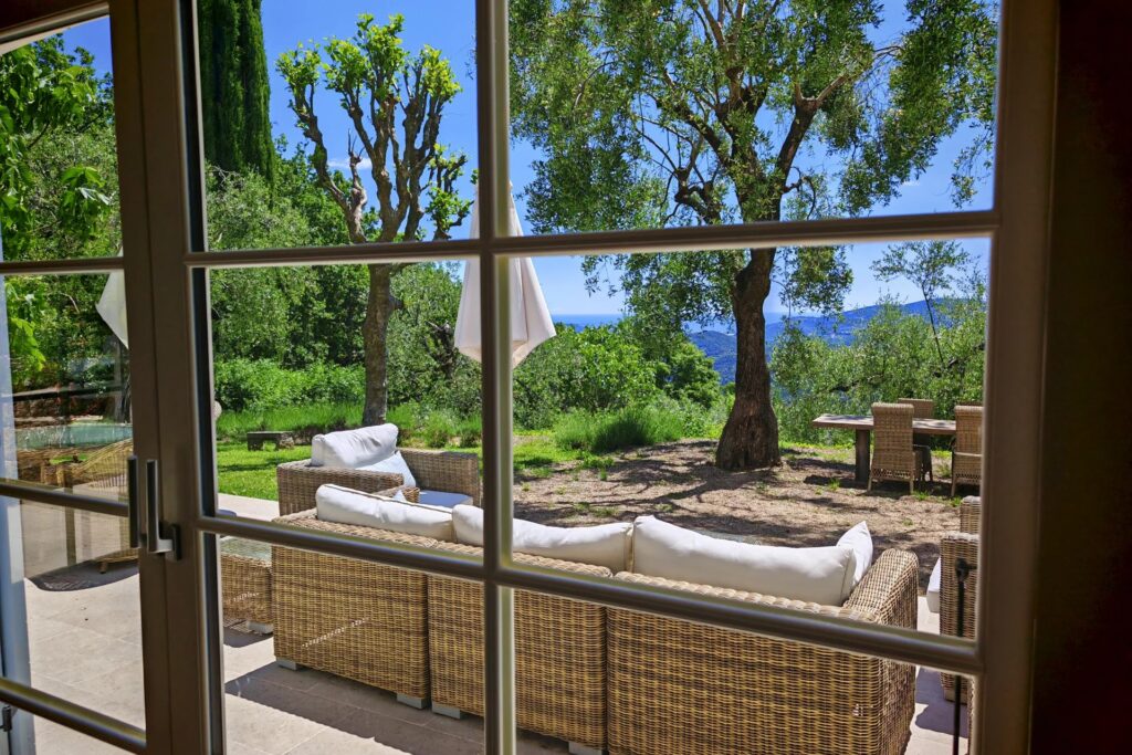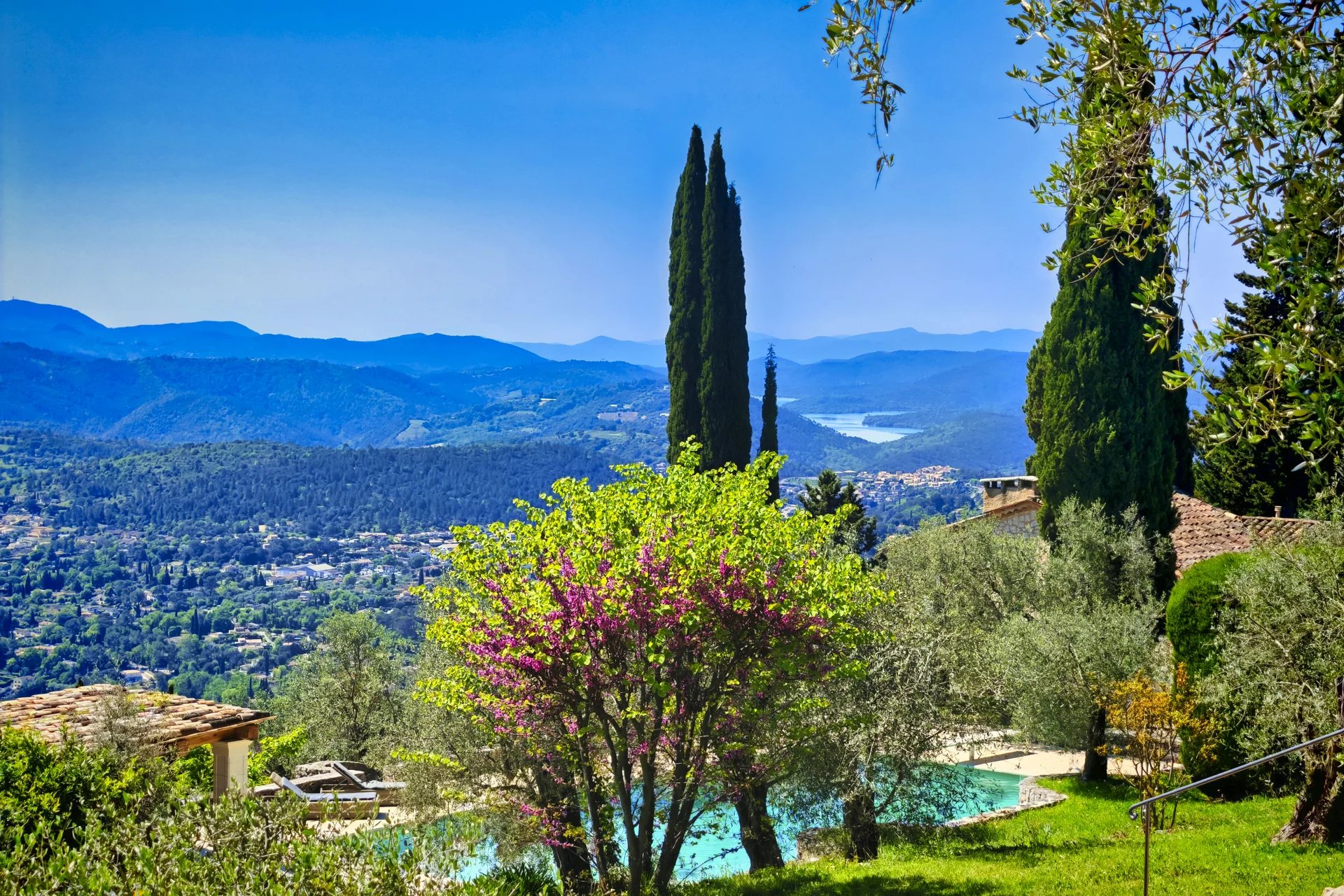Panoramaudsigt løfter ejendommen yderligere og strækker sig fra Cannes-bugten og Lérinsøerne over Estérel-bjergene til det fredelige vand i Saint-Cassien-søen.