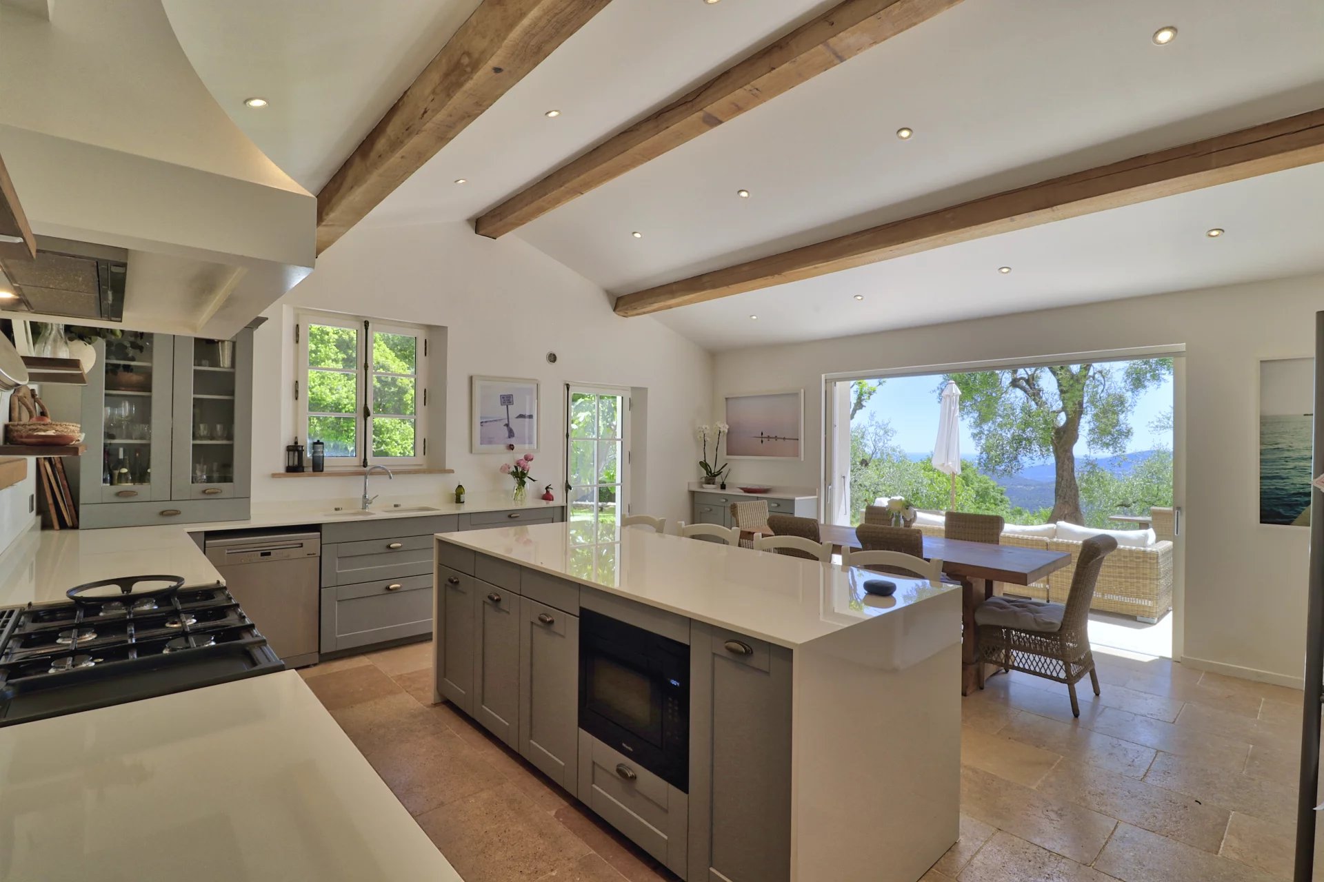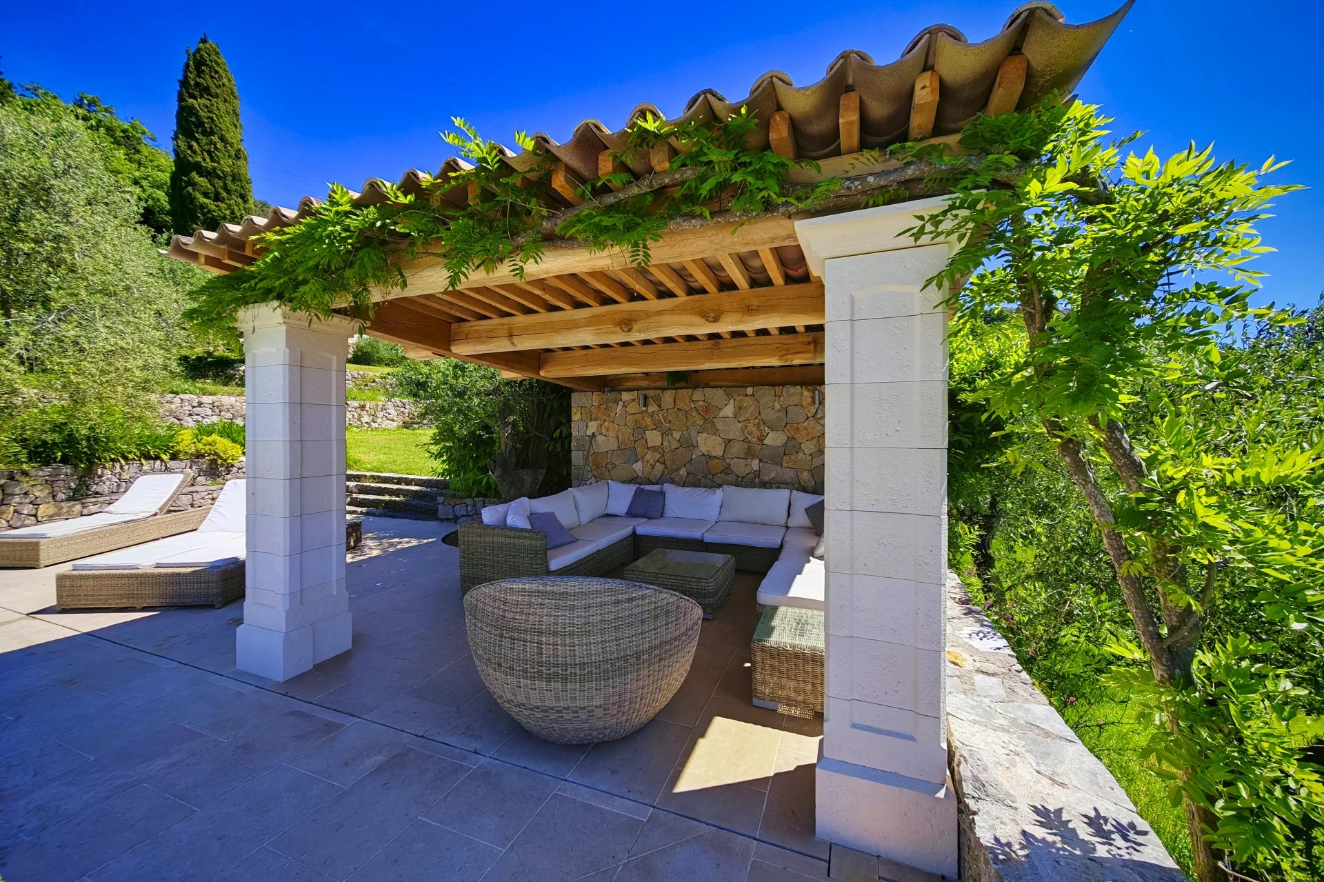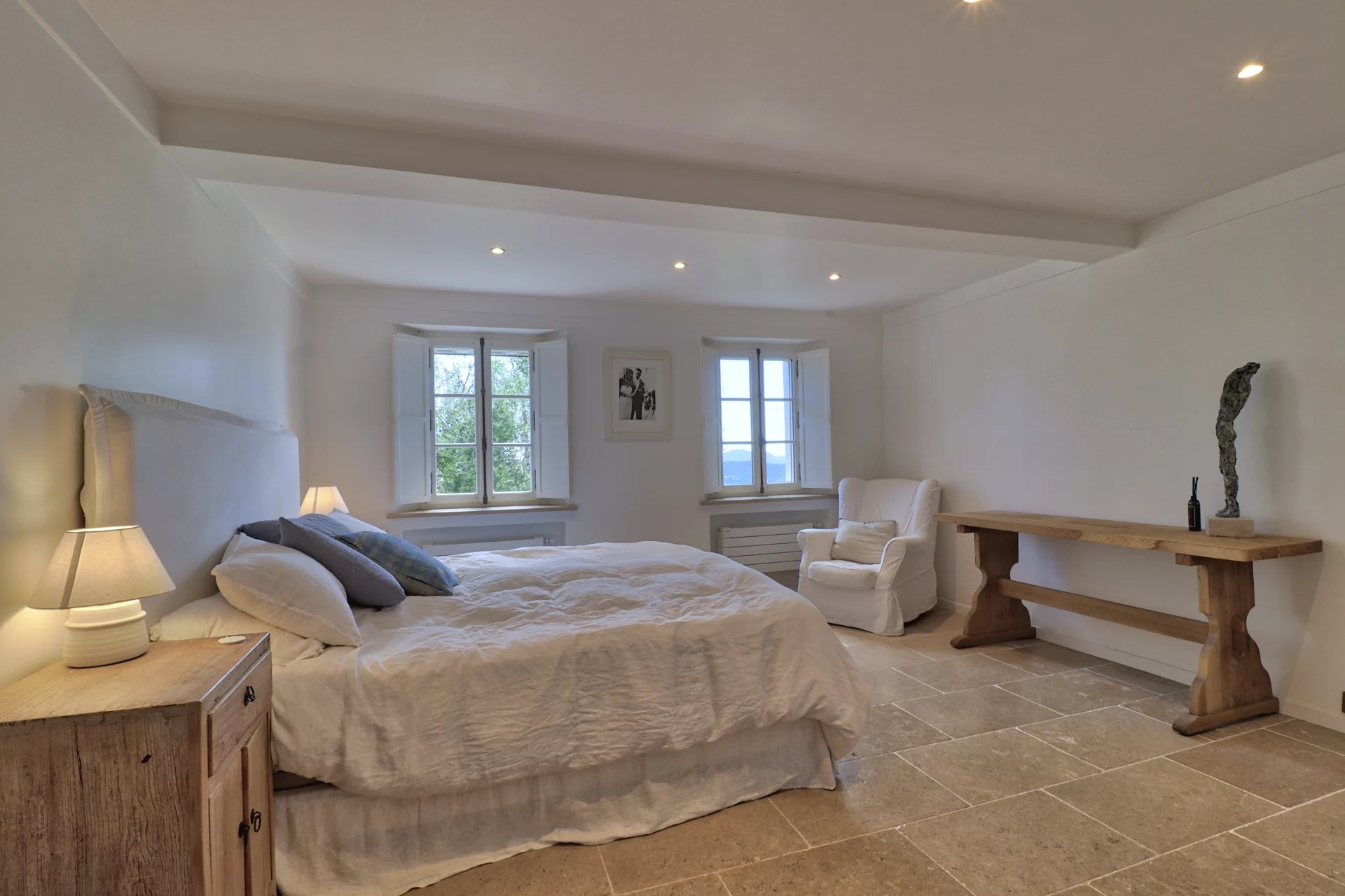 Panoramaudsigt løfter ejendommen yderligere og strækker sig fra Cannes-bugten og Lérinsøerne over Estérel-bjergene til det fredelige vand i Saint-Cassien-søen.