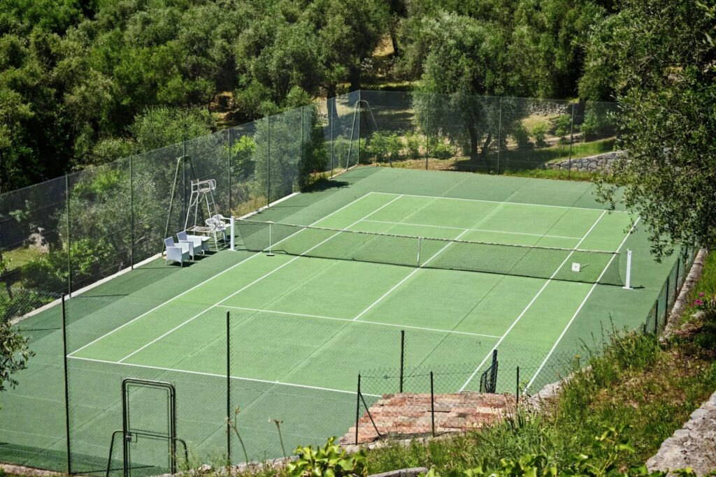 Udendørsmiljøet er designet til både afslapning og underholdning: store terrasser, et skyggefuldt loungeområde ved poolen og en privat tennisbane, der er perfekt til at nyde lange solrige eftermiddage.