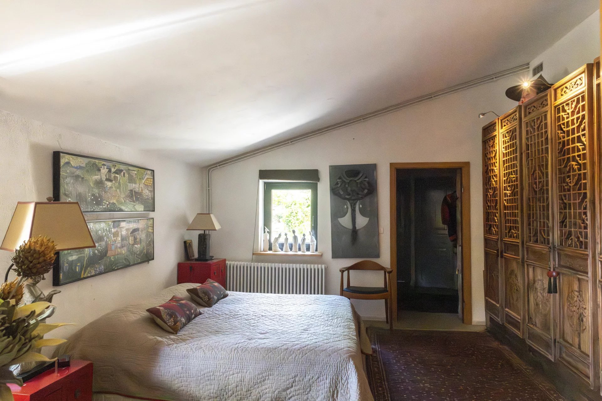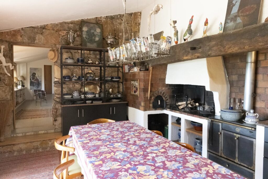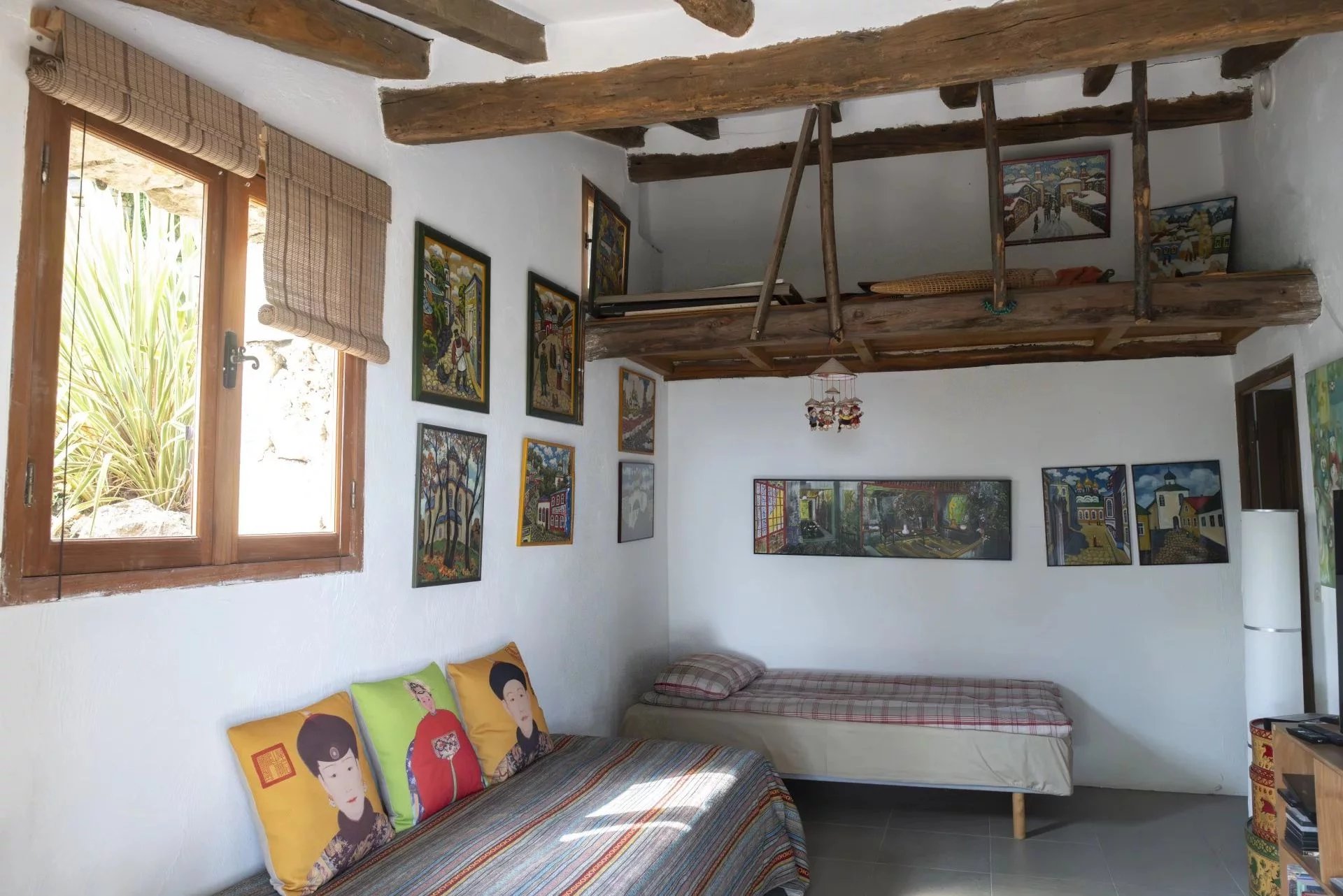 Køkkenet fører ind i den hyggelige stue med brændeovn og videre til soveværelset med eget badeværelse. Det andet hus består af 2 soveværelser, 1 kontor (eller 3. soveværelse), et brusebad, toilet og opbevaringsrum/kælder. To yderligere stenudhuse er indrettet som studioværelser, et med en dobbeltseng, brusebad og toilet, det andet mere som et overløbsværelse eller et værksted/kontor.