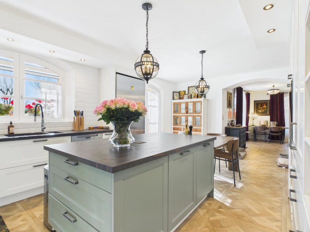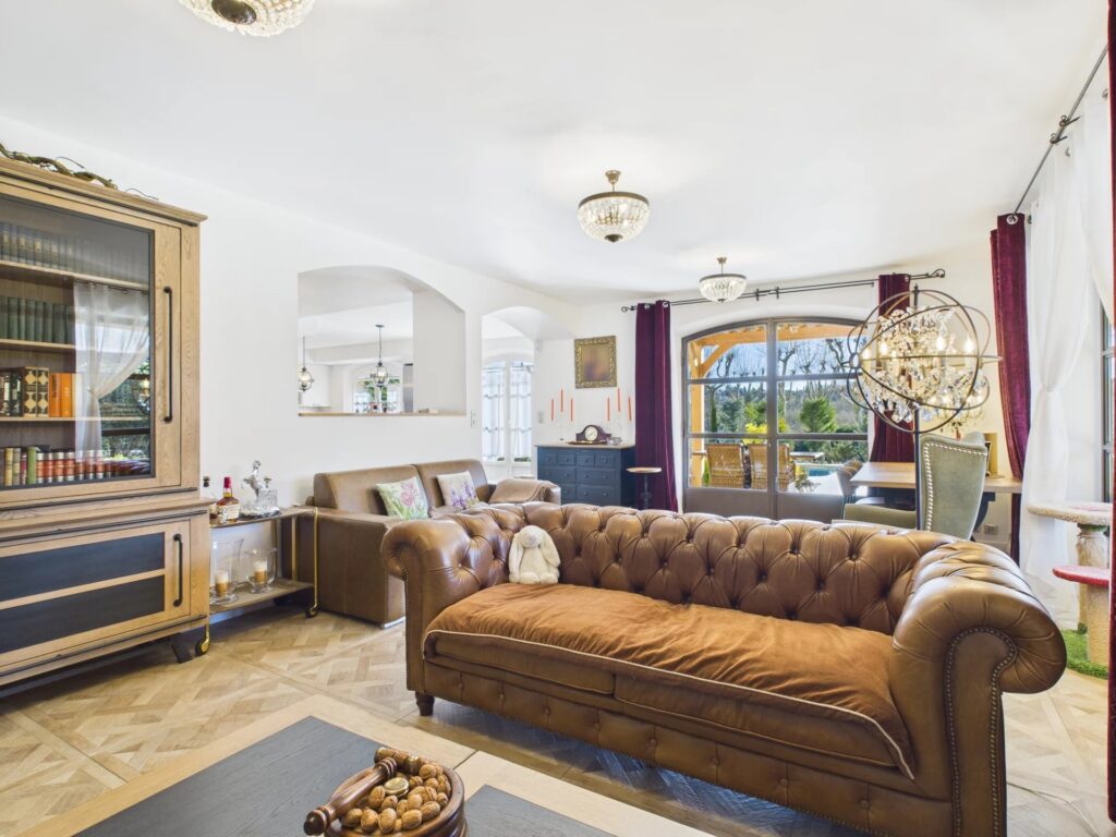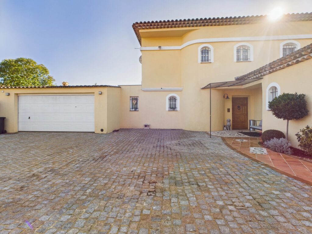 Udendørs har den sydvendte terrasse udsigt over swimmingpoolen og den frodige have. En dobbelt garage og ekstra parkering til fem til seks biler fuldender denne exceptionelle ejendom.
