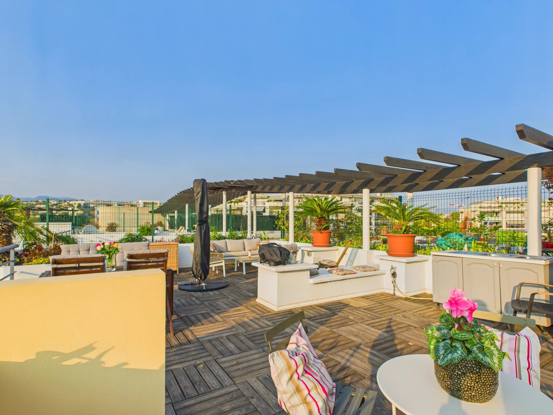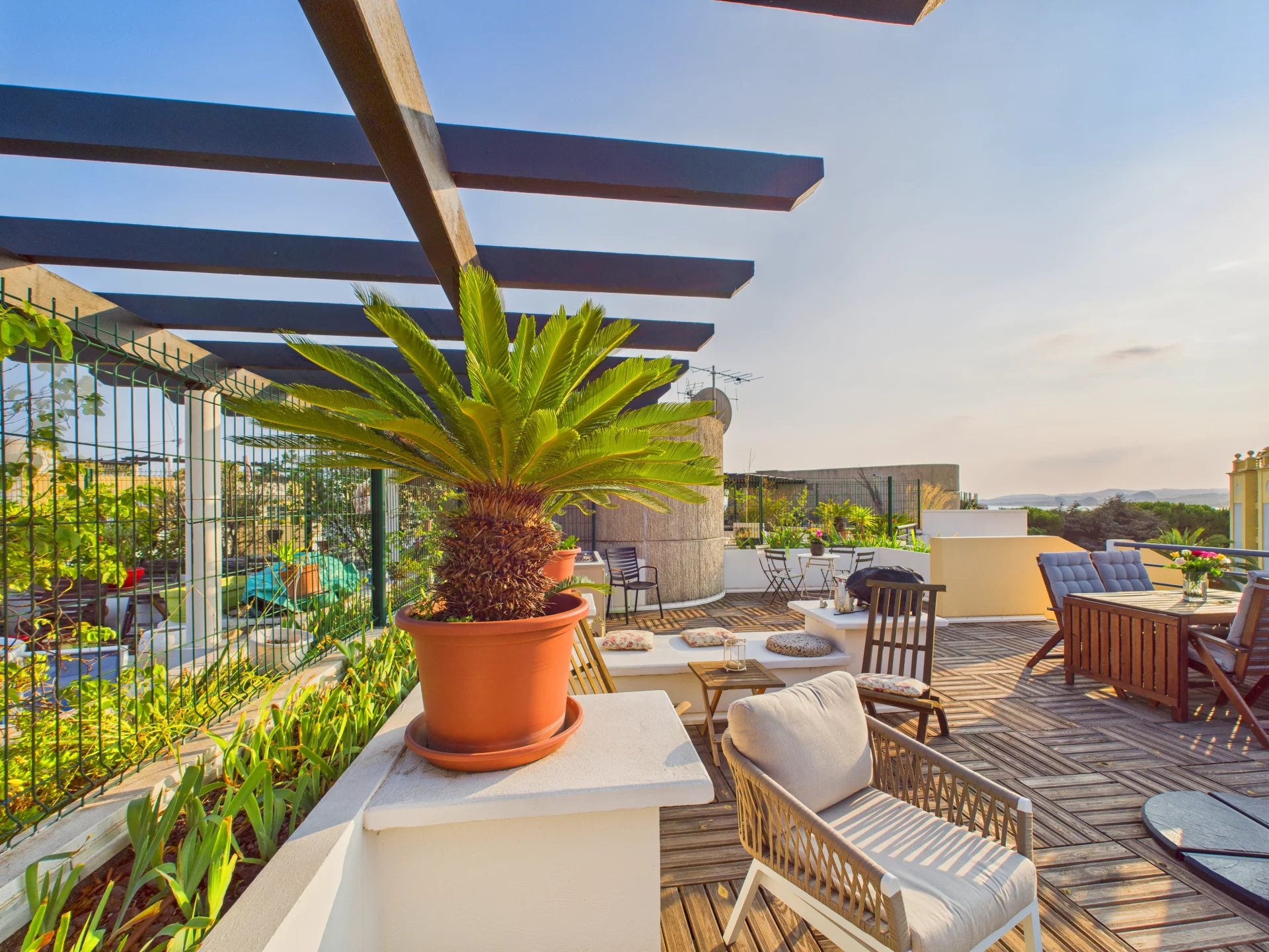 Et iøjnefaldende træk er den generøse tagterrasse, der tilbyder åben, uforstyrret udsigt over de omkringliggende bakker og Middelhavet.