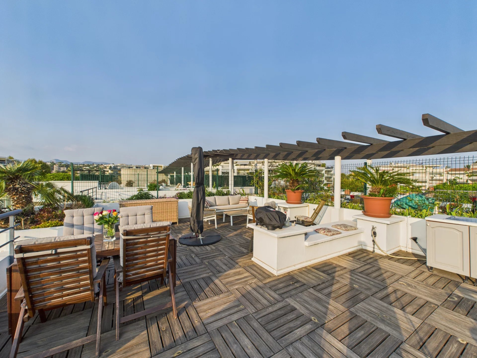 En trappe fra hovedterrassen fører til det private tagområde – et hævet fristed med spektakulær udsigt og rigelig plads til flere lounge- eller spisepladser.