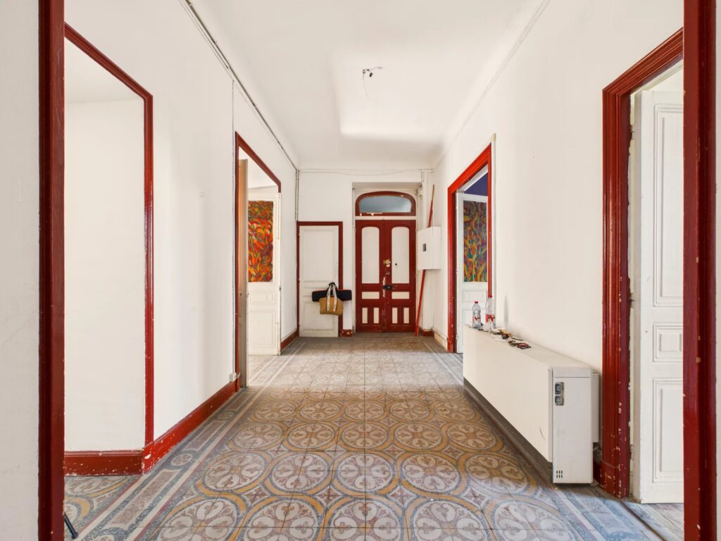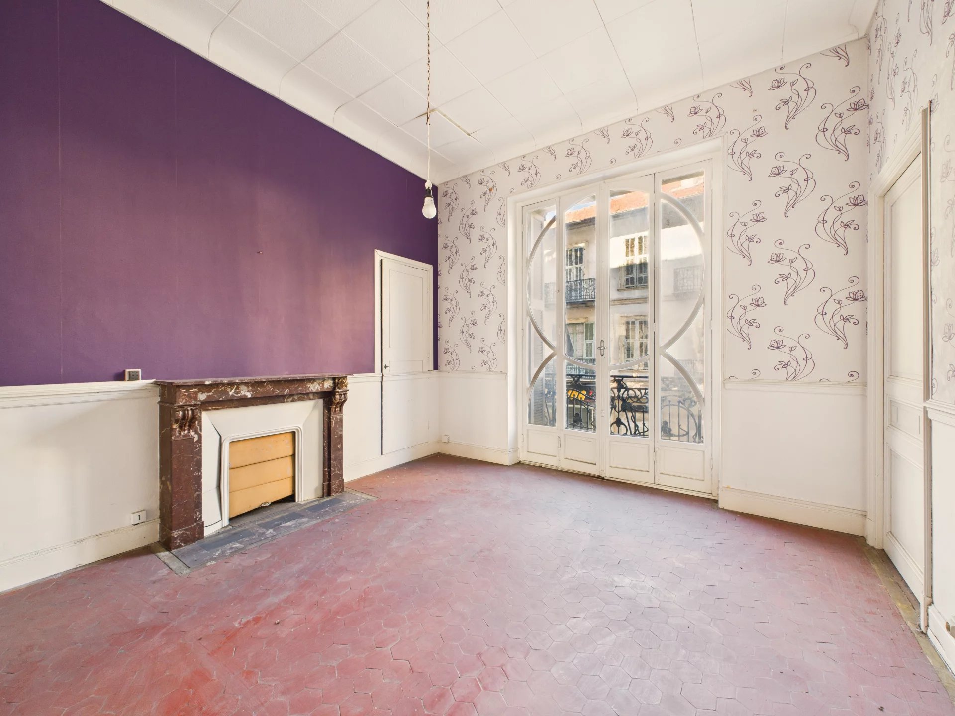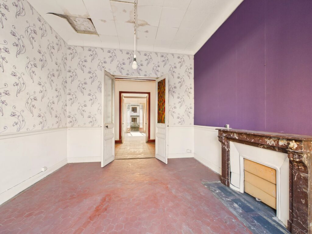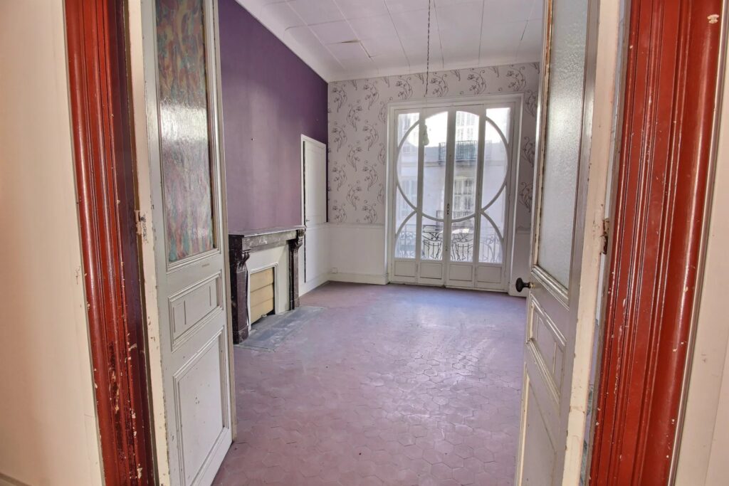 Denne lejlighed er fyldt med naturligt lys og byder på autentisk charme med højt til loftet, originale (ikke-funktionelle) pejse og en balkon. Den er i øjeblikket fordelt på 5 værelser og tilbyder adskillige muligheder for ombygning.
