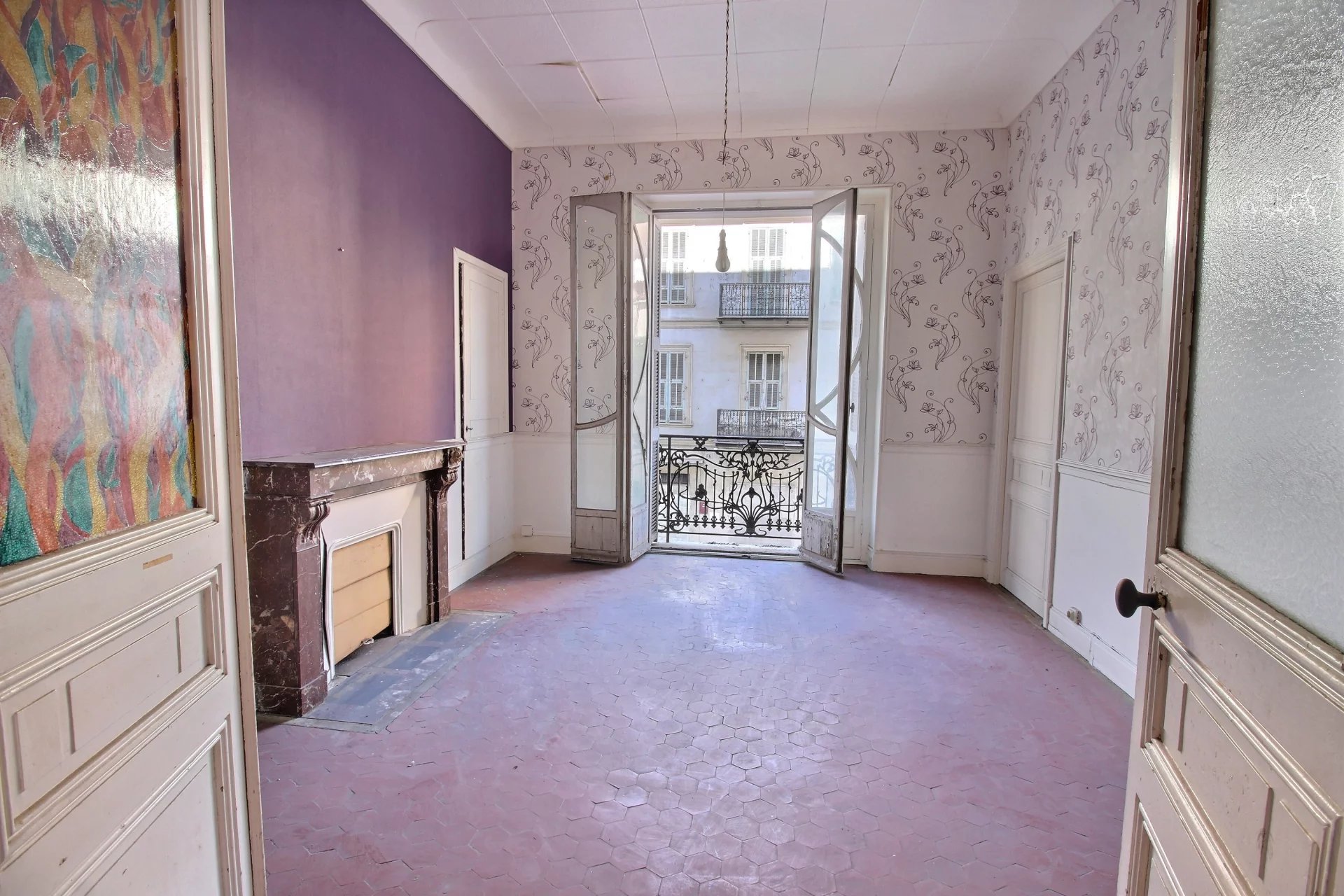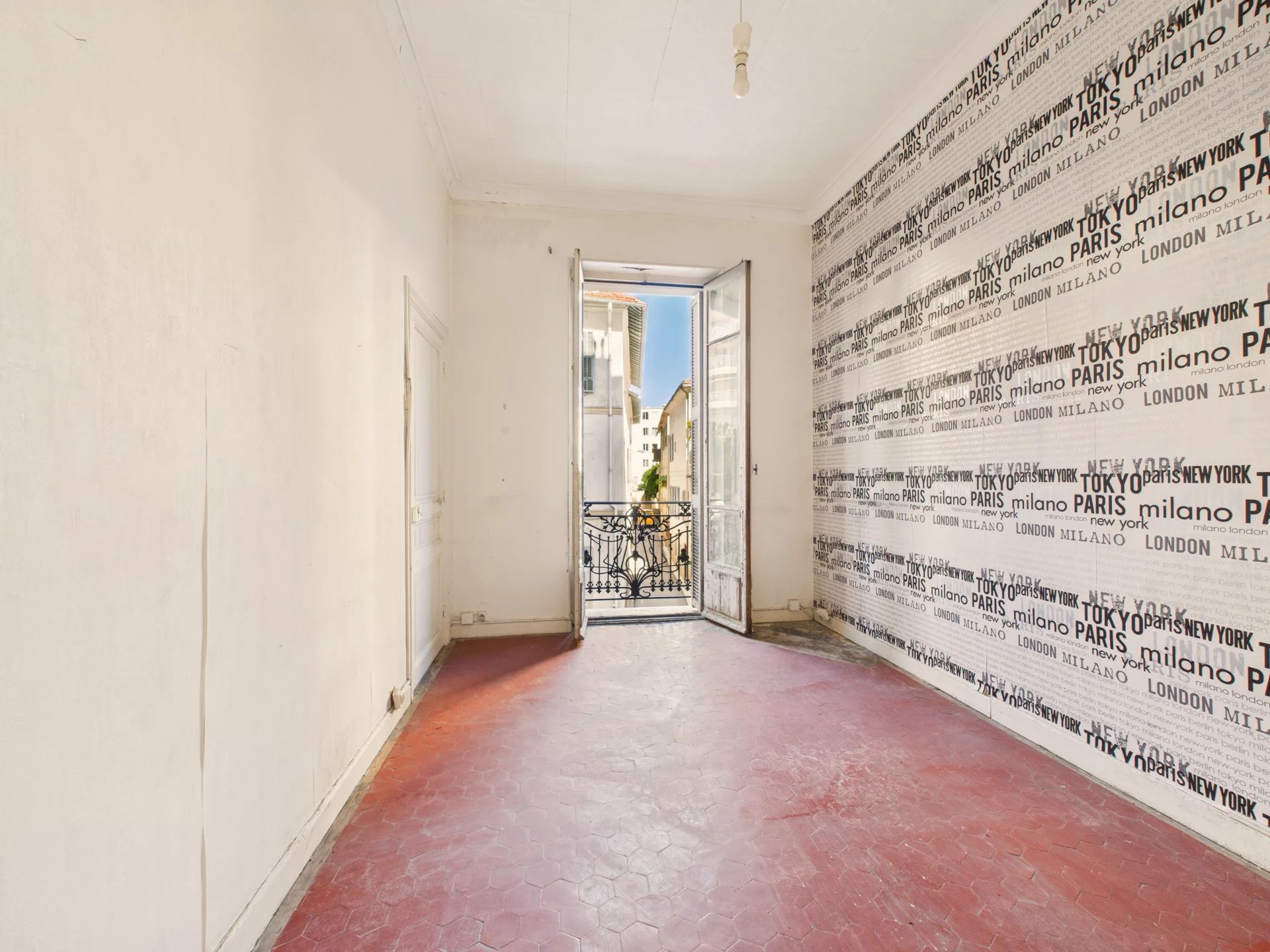 Rummelig lejlighed på 121 m², der kan renoveres og tilpasses din smag, beliggende på 1. sal i en smuk herskabelig ejendom med elevator i det eftertragtede Fleurs-kvarter. Ideelt beliggende, kun få skridt fra stranden og den berømte Promenade des Anglais.