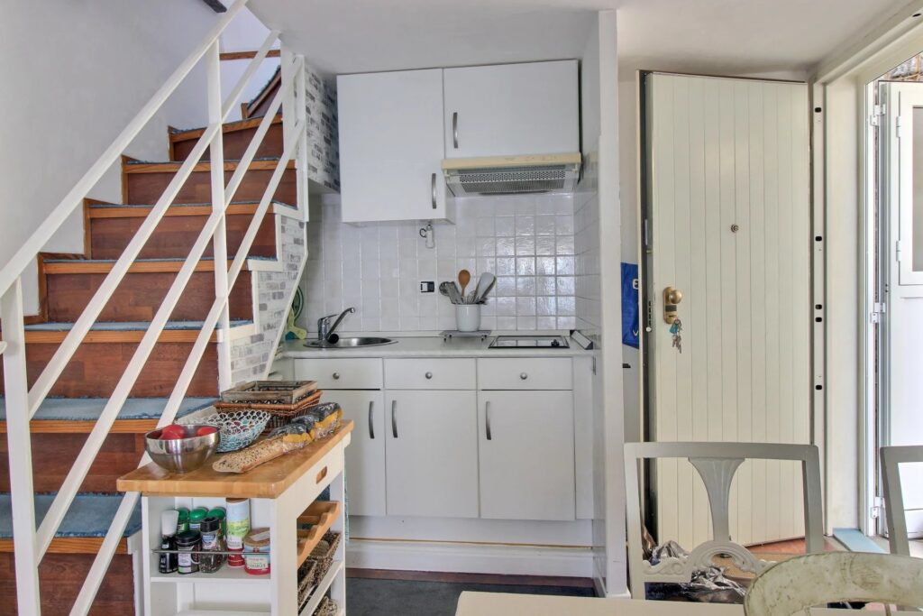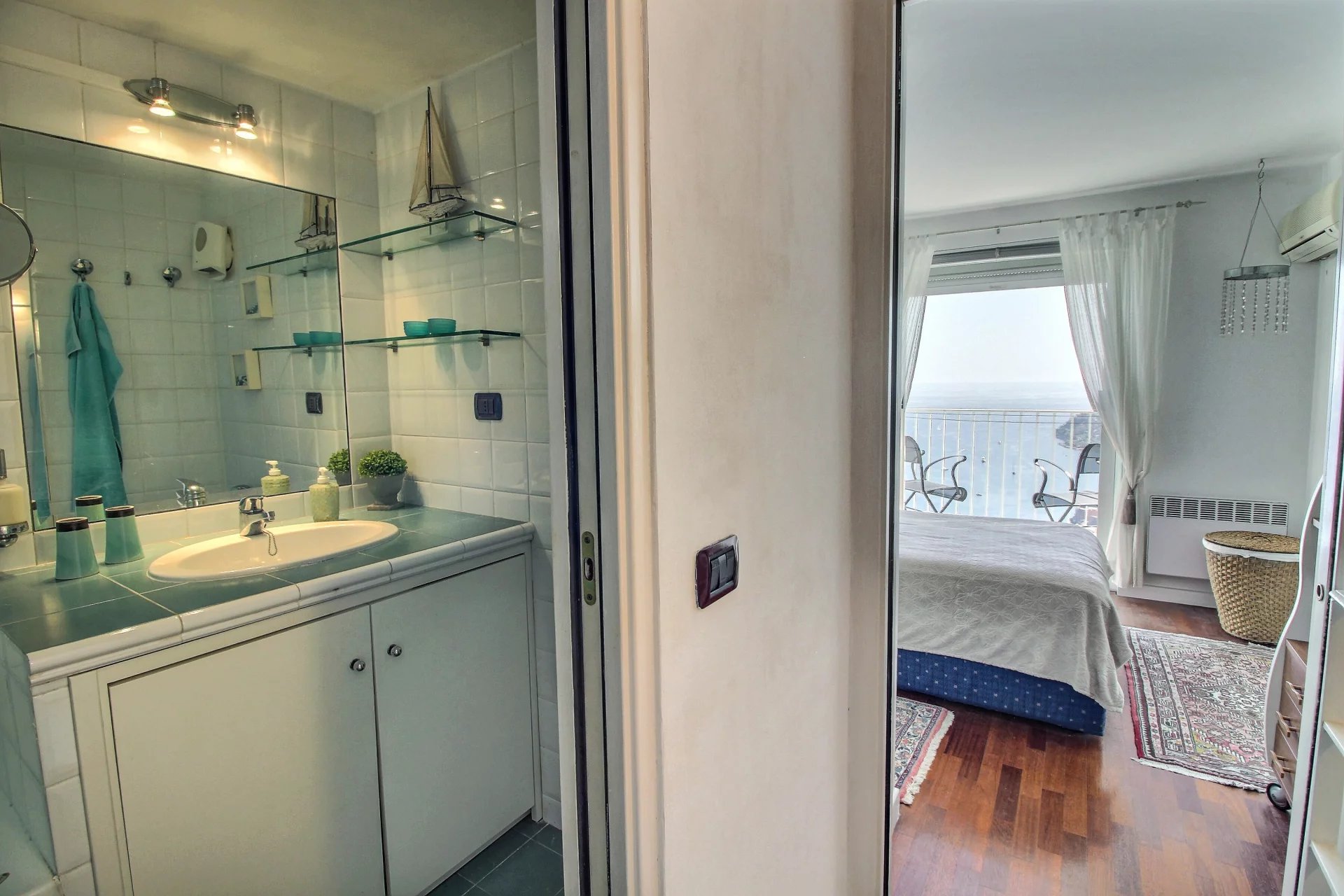 I første plan, en hyggelig stue med åbent køkken ud til en solrig, sydvendt terrasse med udsigt over Middelhavet, den charmerende by Villefranche-sur-Mer og halvøen Saint-Jean-Cap-Ferrat. Terrassen er rummelig nok til at rumme både et spisebord og lænestole.