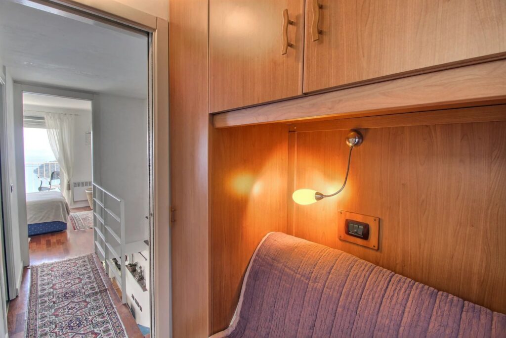 En trappe fører til øverste etage, hvor du finder et roligt soveværelse med egen privat balkon, ideel til at nyde morgensolen. Denne etage inkluderer også et badeværelse og et fleksibelt ekstra værelse, der kan fungere som gæsteværelse, kontor eller opbevaringsområde.