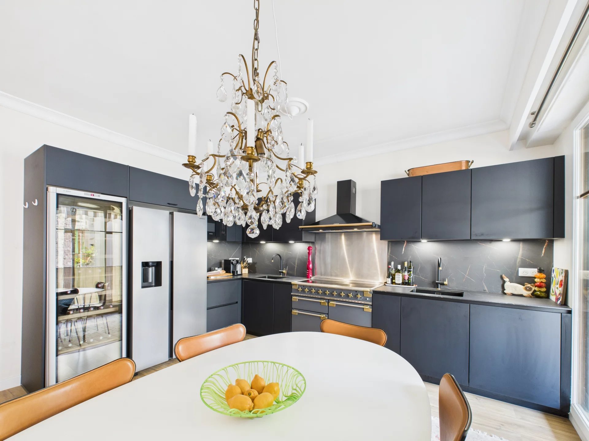 Lejligheden består af en stor stue på næsten 37 m² med et fuldt udstyret specialbygget køkken, der åbner ud til en 9 m² vestvendt terrasse udstyret med en ny elektrisk markise. Soveområdet består af to soveværelser beliggende på gårdsiden, i absolut ro, med udgang til en 3 m² østvendt altan. Der er også et brusebad med toilet, et badeværelse og et separat toilet i japansk stil.