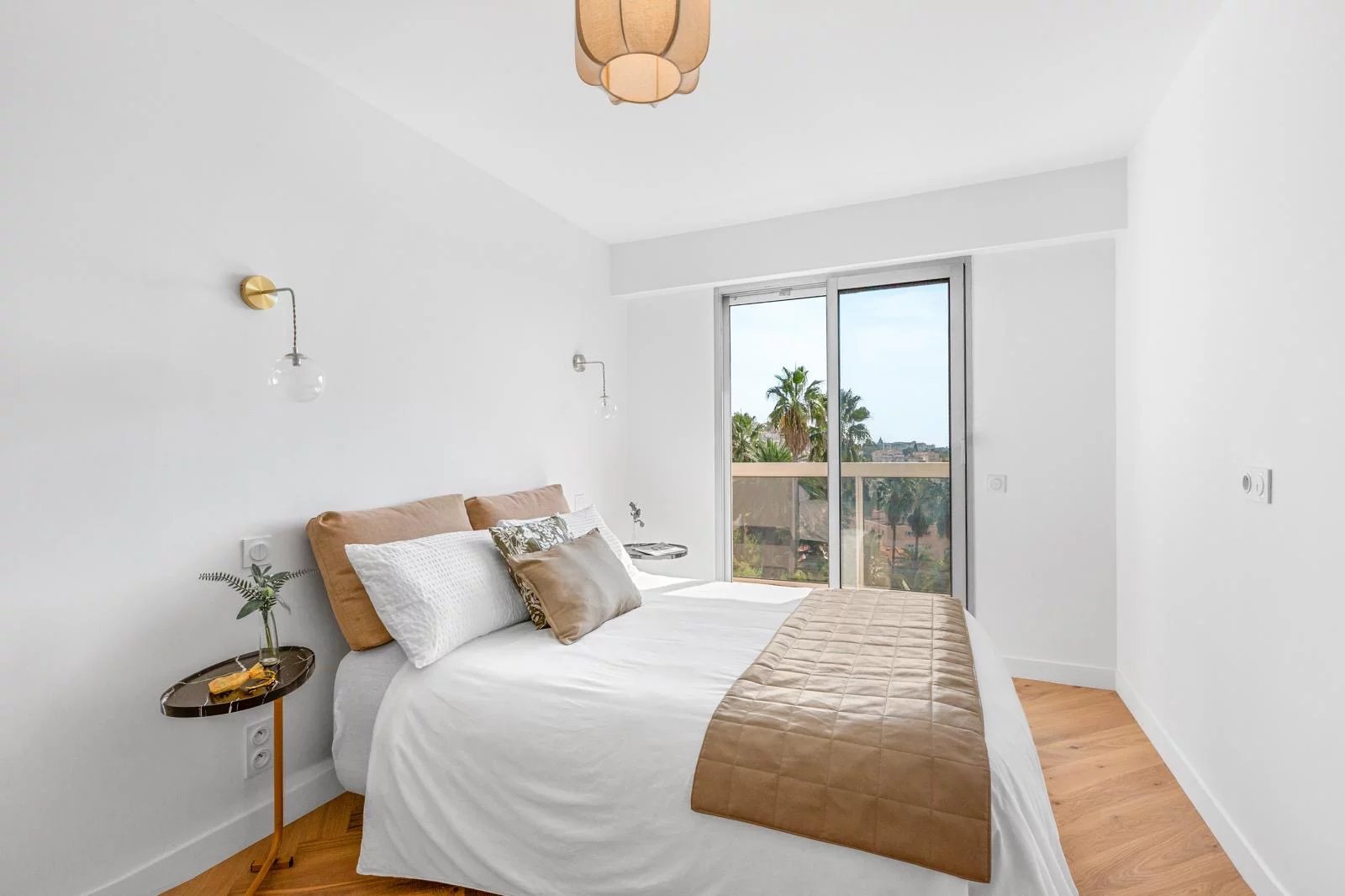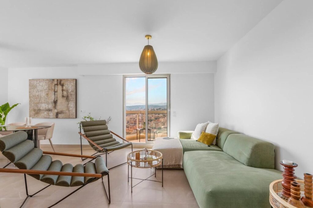 Beliggende på 4. og øverste sal byder den dig velkommen med en pragtfuld dobbeltstue med åbent køkken, udvidet med en smuk terrasse med panoramaudsigt over havet, Nice Slot og byen – ideel til måltider med venner. Dette smukke receptionsområde, designet som et ægte opholdsrum, skiller sig ud med sin elegance og hyggelige atmosfære.
