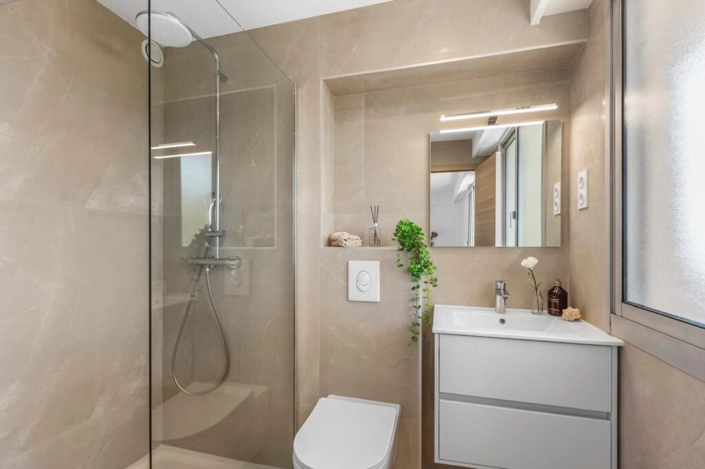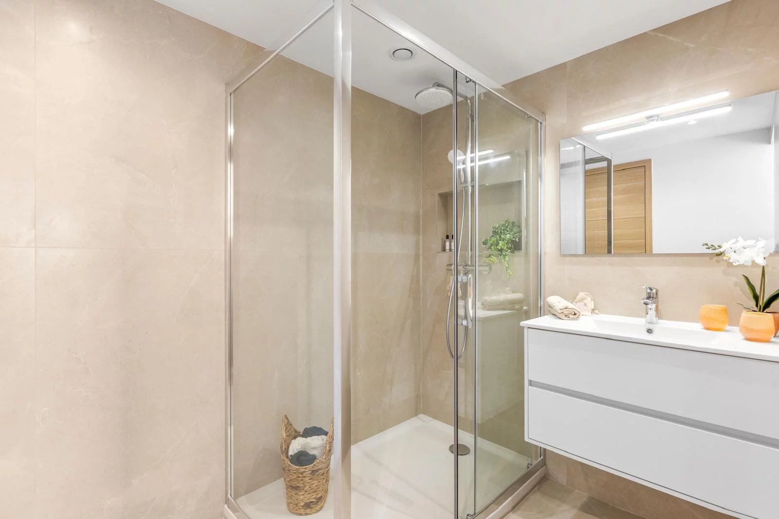 På oversiden er der en dejlig master suite med balkon med udsigt over byen og eget brusebad, en anden suite med havudsigt og privat brusebad samt et tredje soveværelse med balkon. Et ekstra brusebad, separat toilet og adskillige indbyggede opbevaringspladser bidrager til lejlighedens komfort.