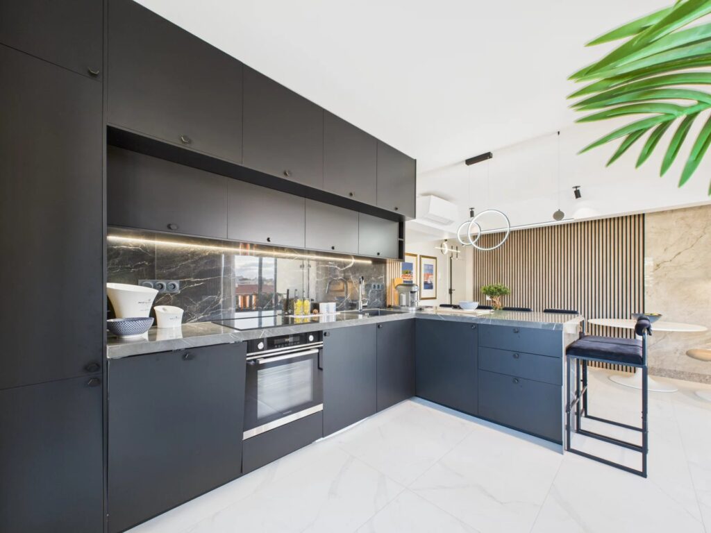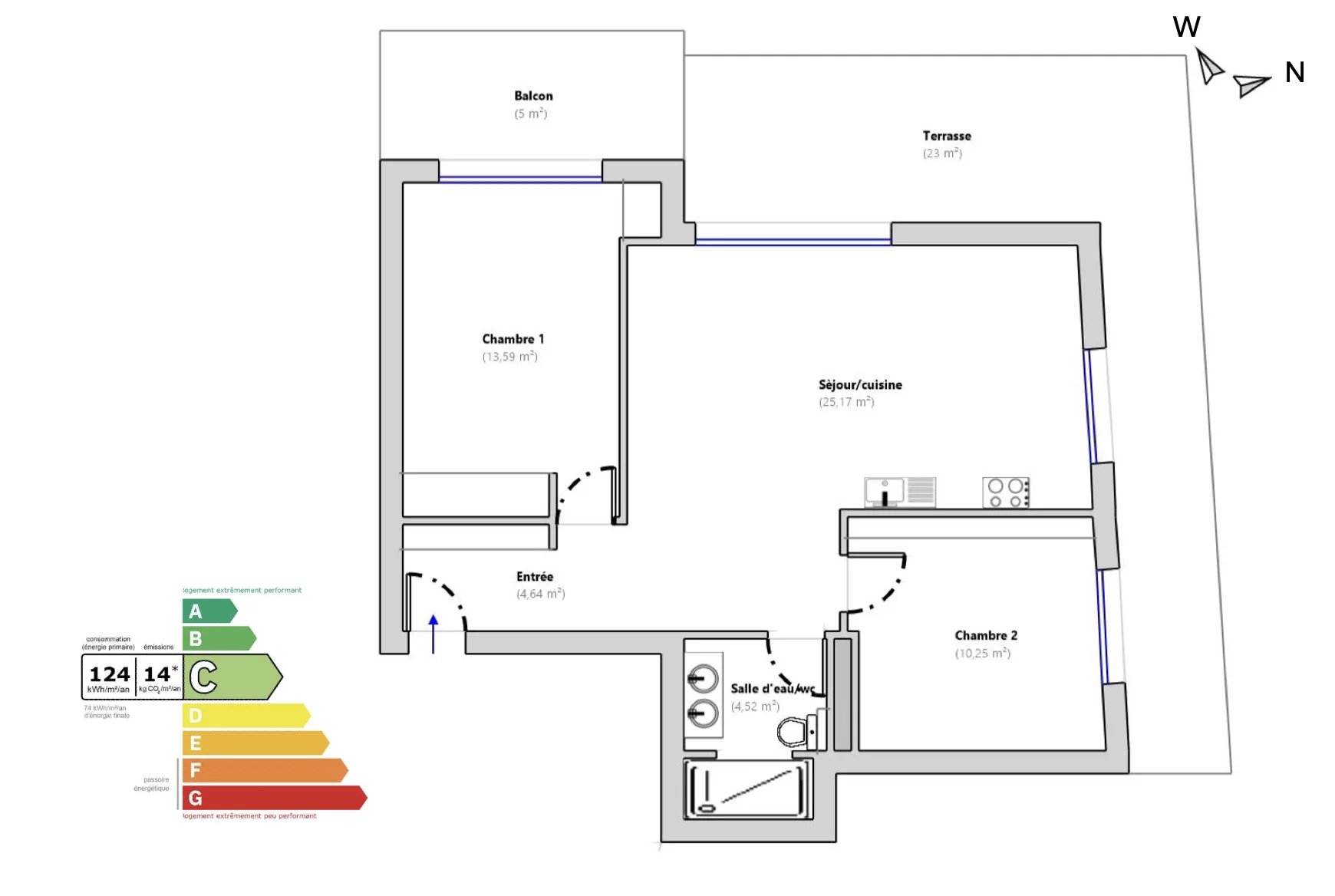 Med et areal på cirka 60 m² åbner ejendommen op til en entré med indbyggede skabe, der fører til en lys stue, der forlænges af et rummeligt, fuldt udstyret åbent køkken. Denne stue giver adgang til en 23 m² hjørneterrasse med uhindret udsigt over bakkerne, bjergene og byen.