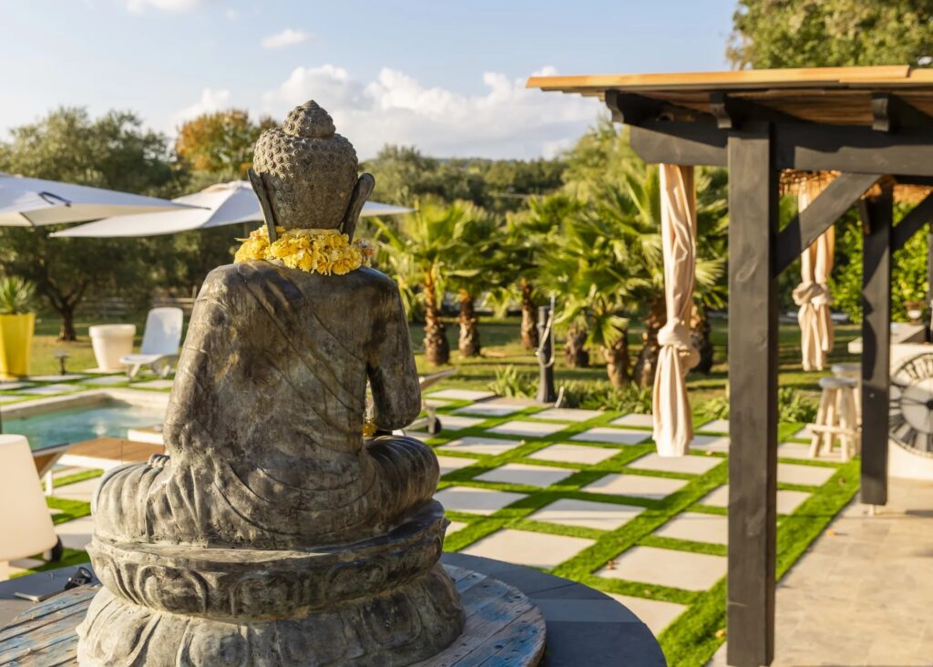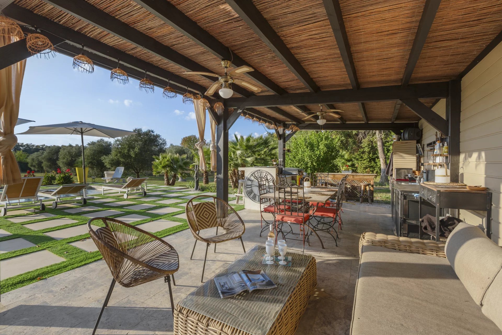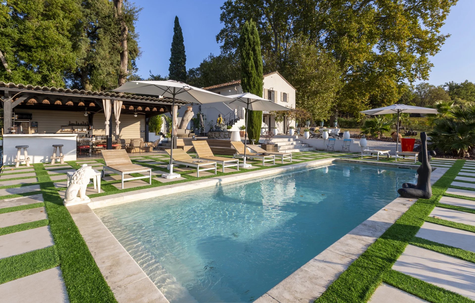 Udenfor er der flere terrasser og afslapningsområder, herunder en overdækket terrasse med sommerkøkken, der åbner ud mod poolen og dens asiatisk-inspirerede loungeområde.