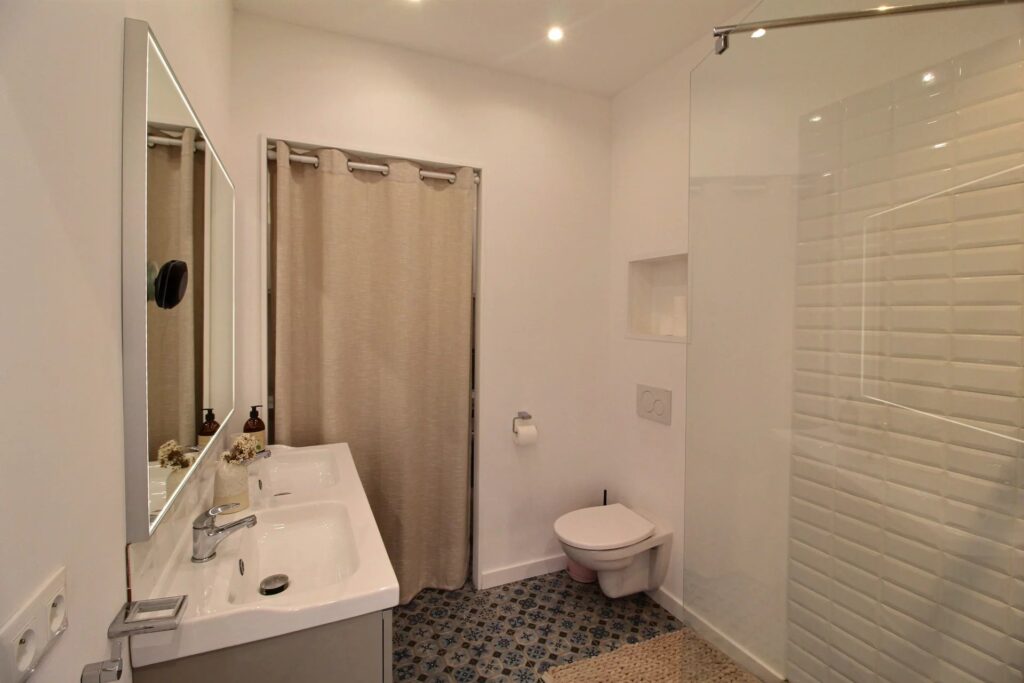 Soveværelset har et walk-in closet, adgang til balkonen og et stilfuldt brusebad i italiensk stil, toilet og et separat vaskerum.