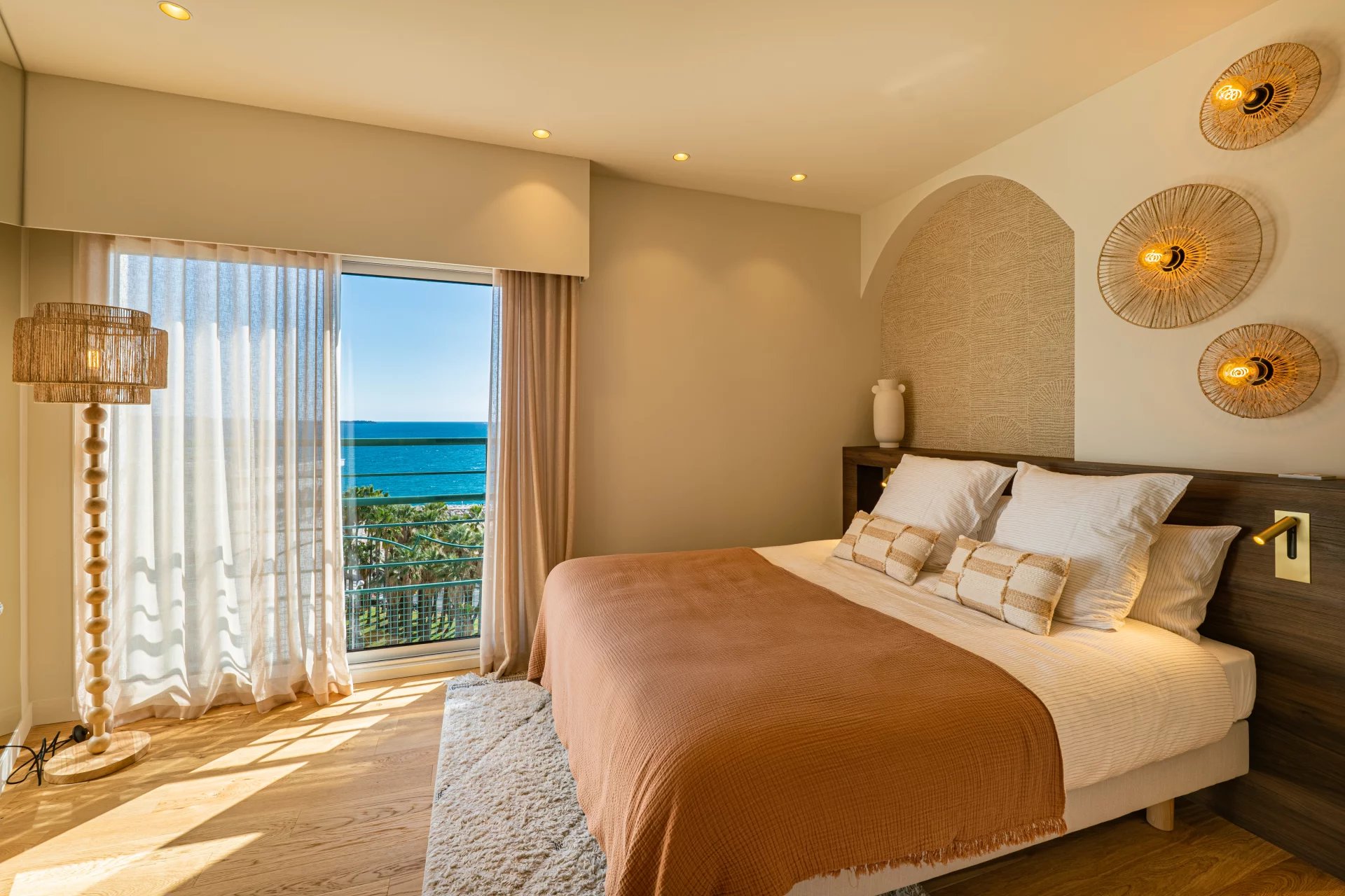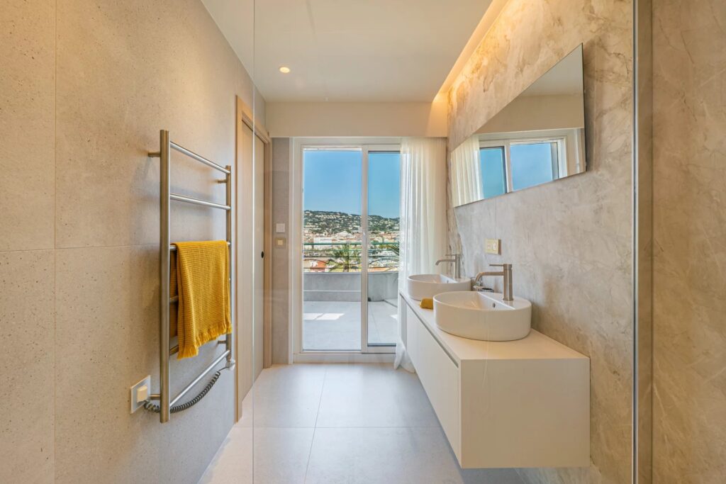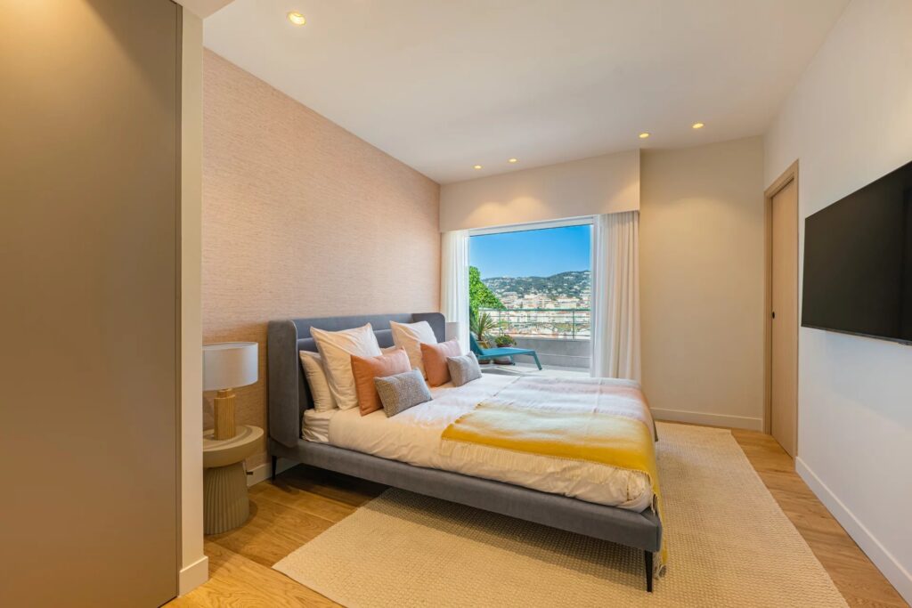 Et soveværelse, der åbner ud til en anden terrasse på østsiden med udsigt over havet og Cannes-bugten. Det har indbygget opbevaring og et privat brusebad.