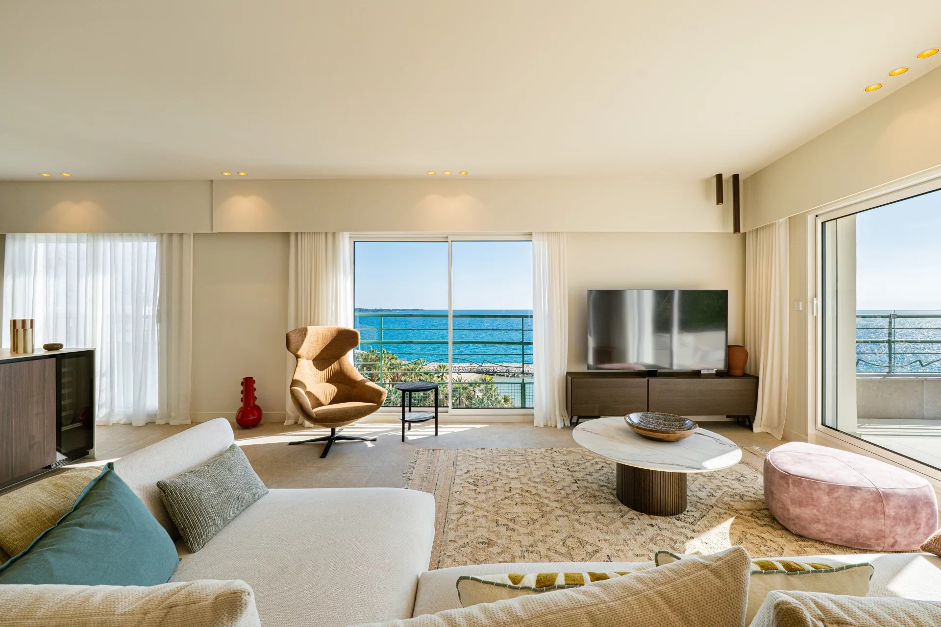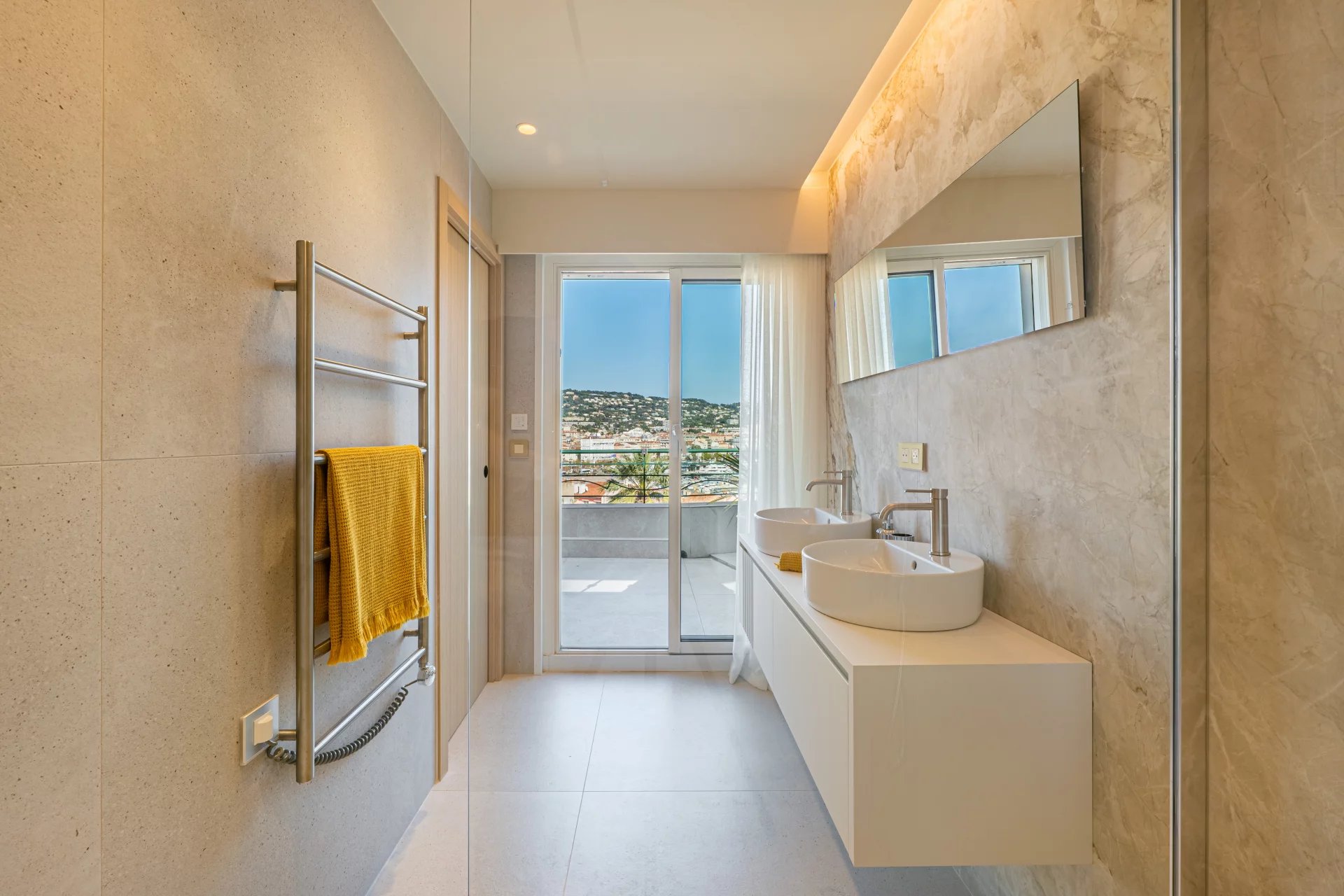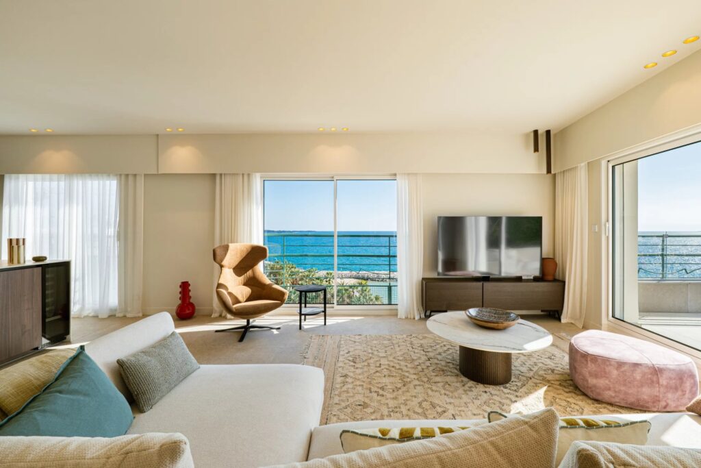 Dette opholdsområde åbner ud til en stor terrasse på cirka 110 m² mod syd, med en enestående panoramaudsigt over havet, Estérel-bjergene og Lérins-øerne.