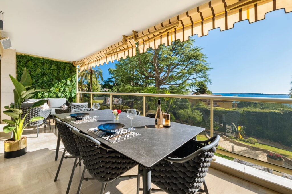 Lejligheden består af en lys stue med et fuldt udstyret åbent køkken, der åbner ud til en stor terrasse med betagende udsigt over havet og Lérins-øerne.