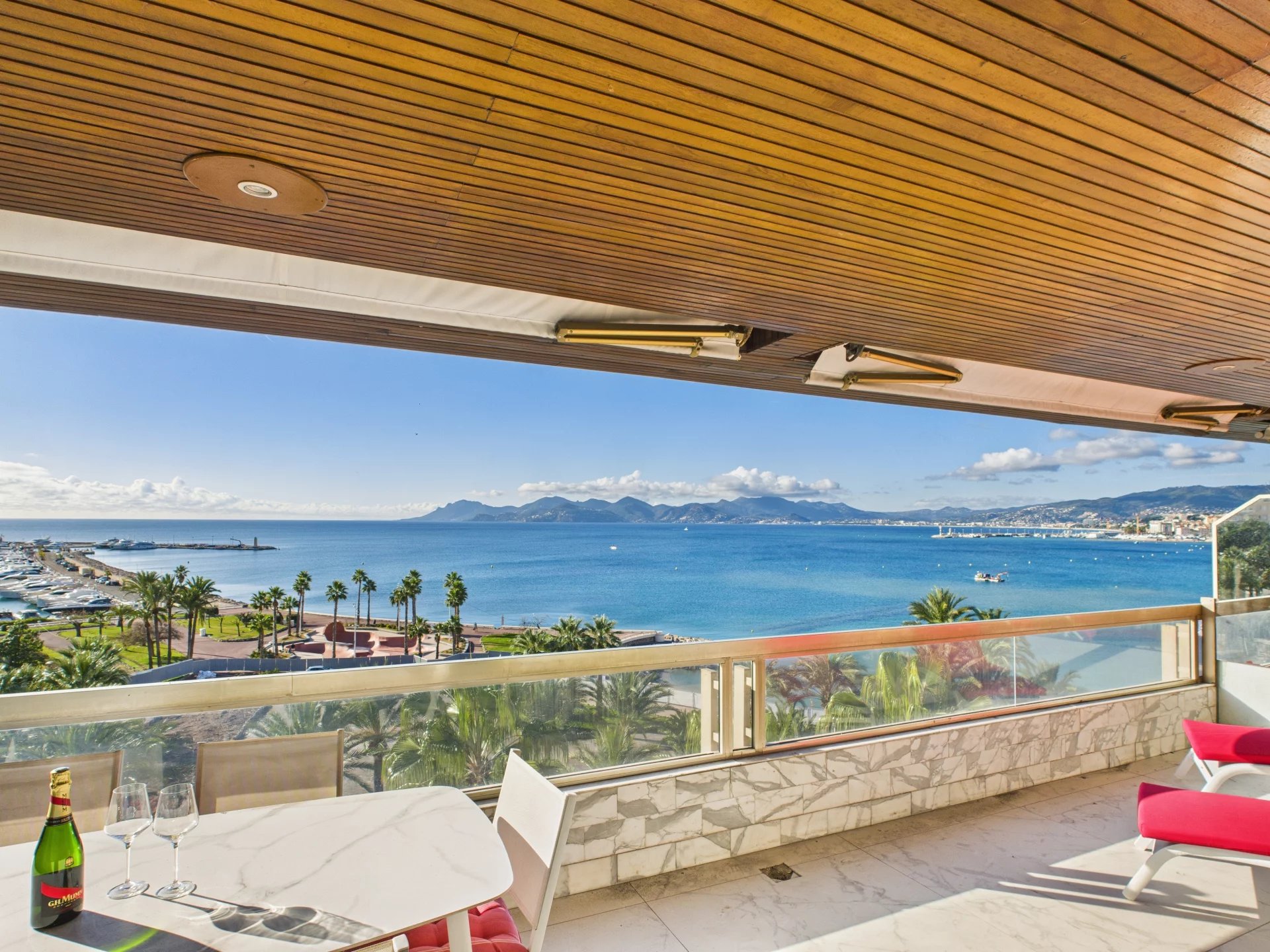 Lejligheden er fuldstændig renoveret med moderne finish og tilbyder en rummelig, lys stue og en spisestue med et fuldt udstyret åbent køkken. Disse rum åbner ud til en terrasse på cirka 20 m², hvor du kan nyde en betagende panoramaudsigt over havet, Estérel, havnen og bjergene.