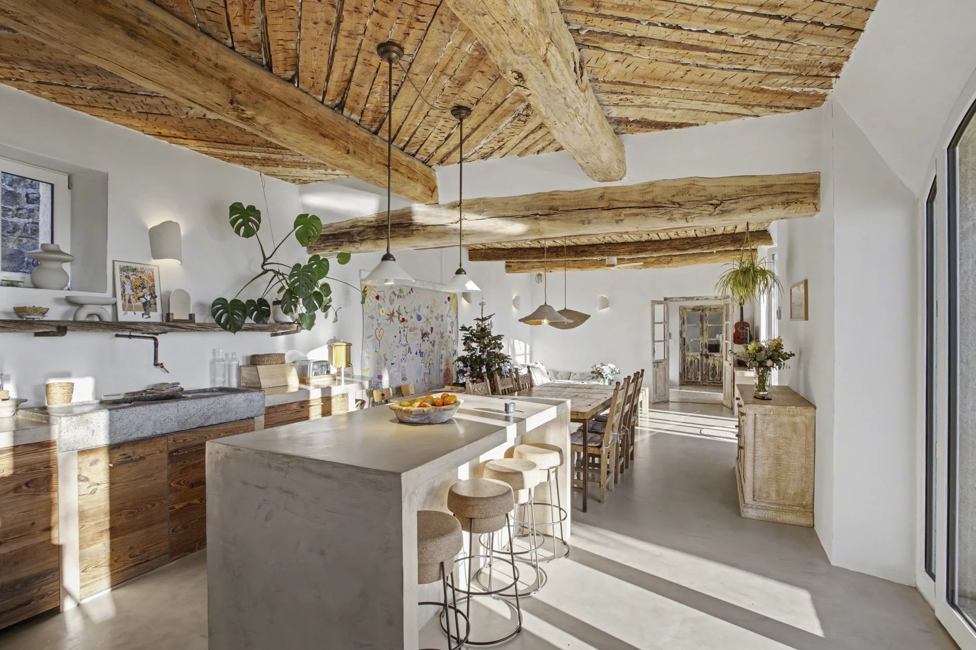 Stueetagen har en rummelig stue med traditionelle bjælkelofter og dobbelte franske døre, der tilbyder enestående lysstyrke og sjælden loftshøjde. Det åbne køkken, varmt og indbydende, er centreret omkring en stor køkkenø og strækker sig ind i et bagkøkken med et vaskerum. På denne etage er der et legerum, der kan omdannes til et soveværelse med eget brusebad, hvis det er nødvendigt, hvilket giver stor fleksibilitet i indretningen.