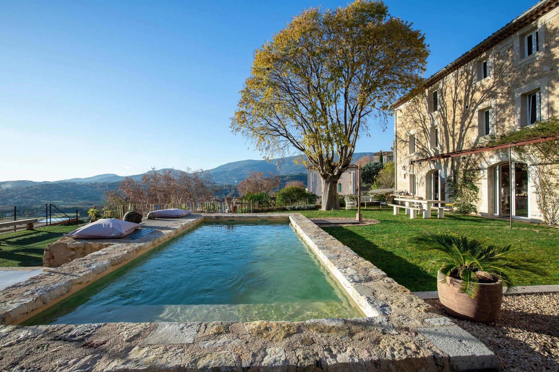 Udenfor byder den 1.000 m² store grund på en smuk stenpool med panoramaudsigt, et pool-hus, en køkkenhave og en carport til to køretøjer.
