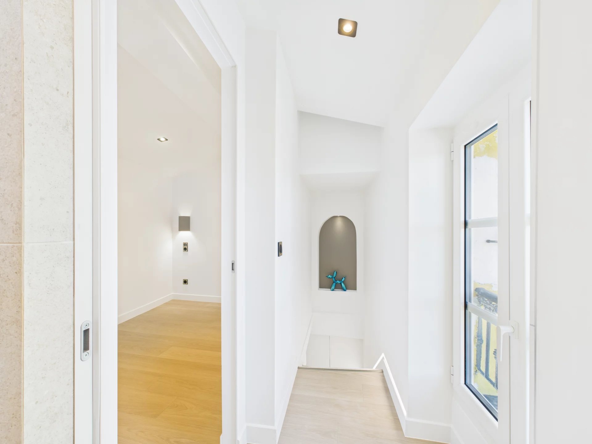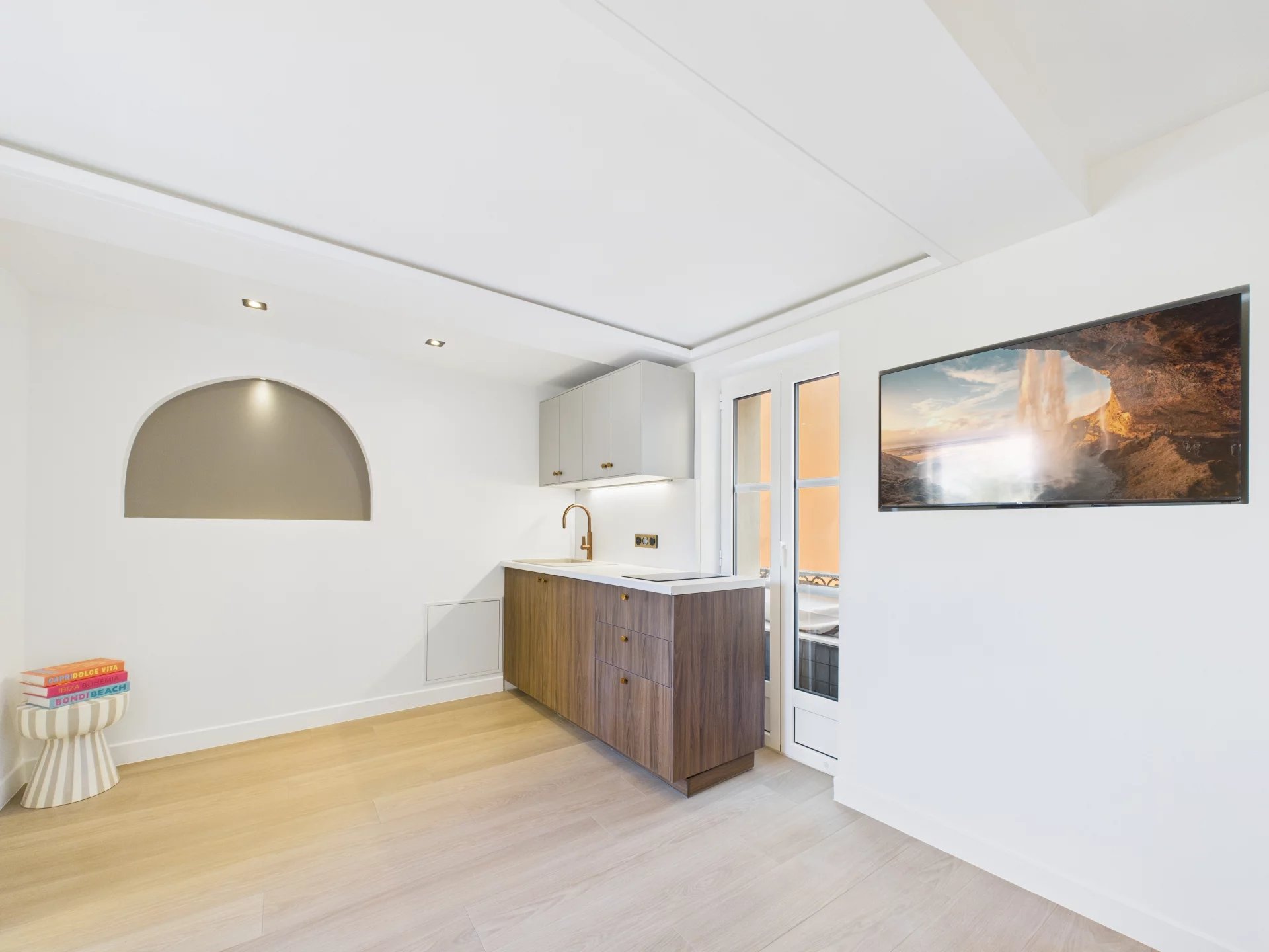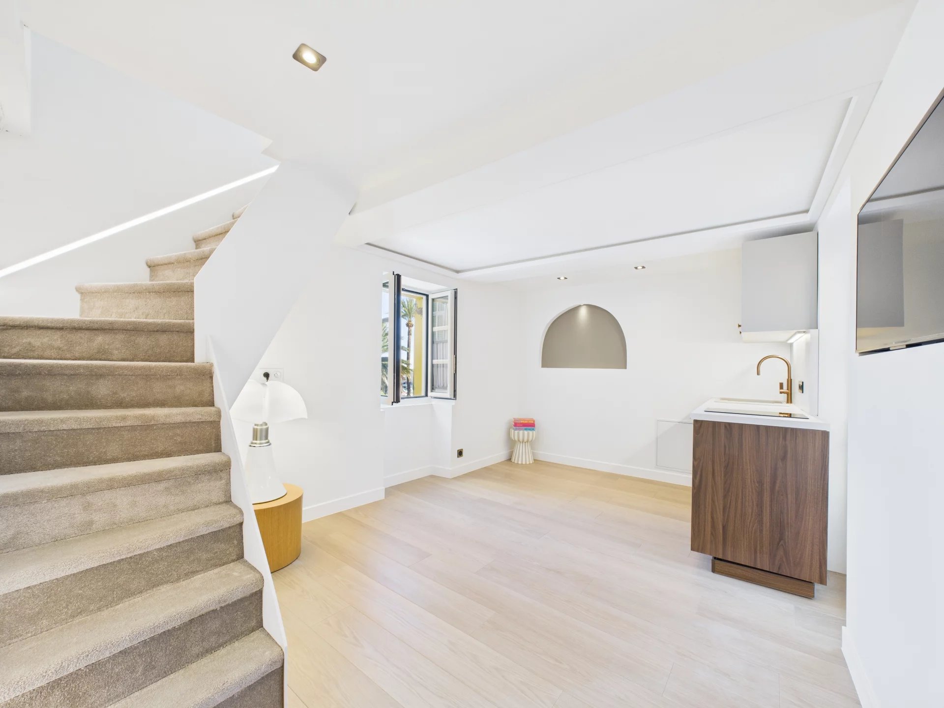 Denne fuldt renoverede lejlighed med materialer af høj kvalitet og raffinerede overflader inkluderer en spisestue med et udstyret køkken, en trappe, der fører til et soveværelse, og et badeværelse/toilet.