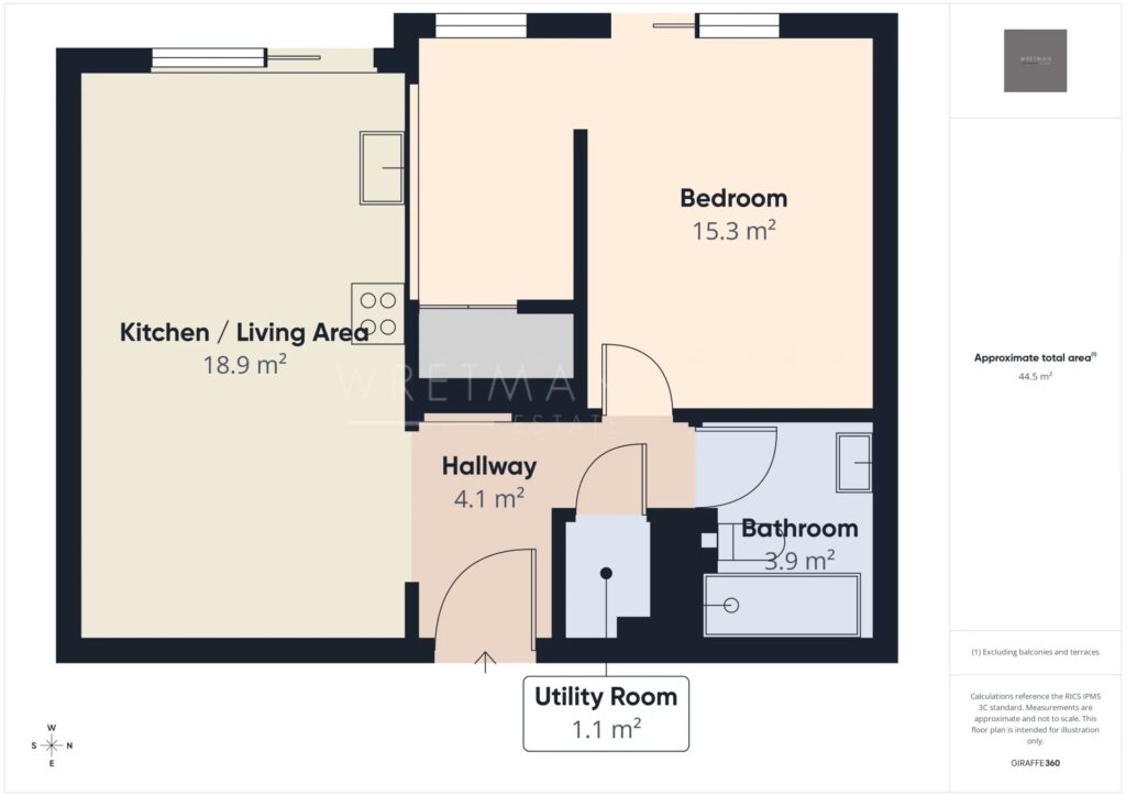 Med et areal på 45 m² består lejligheden af en entré, en stilfuld stue med et fuldt udstyret åbent køkken, et rummeligt soveværelse med walk-in closet og et moderne badeværelse med bruseniche og toilet. Både stuen og soveværelset åbner direkte ud til den store terrasse med udsigt over det charmerende kvarter. Aircondition overalt sikrer optimal komfort året rundt.