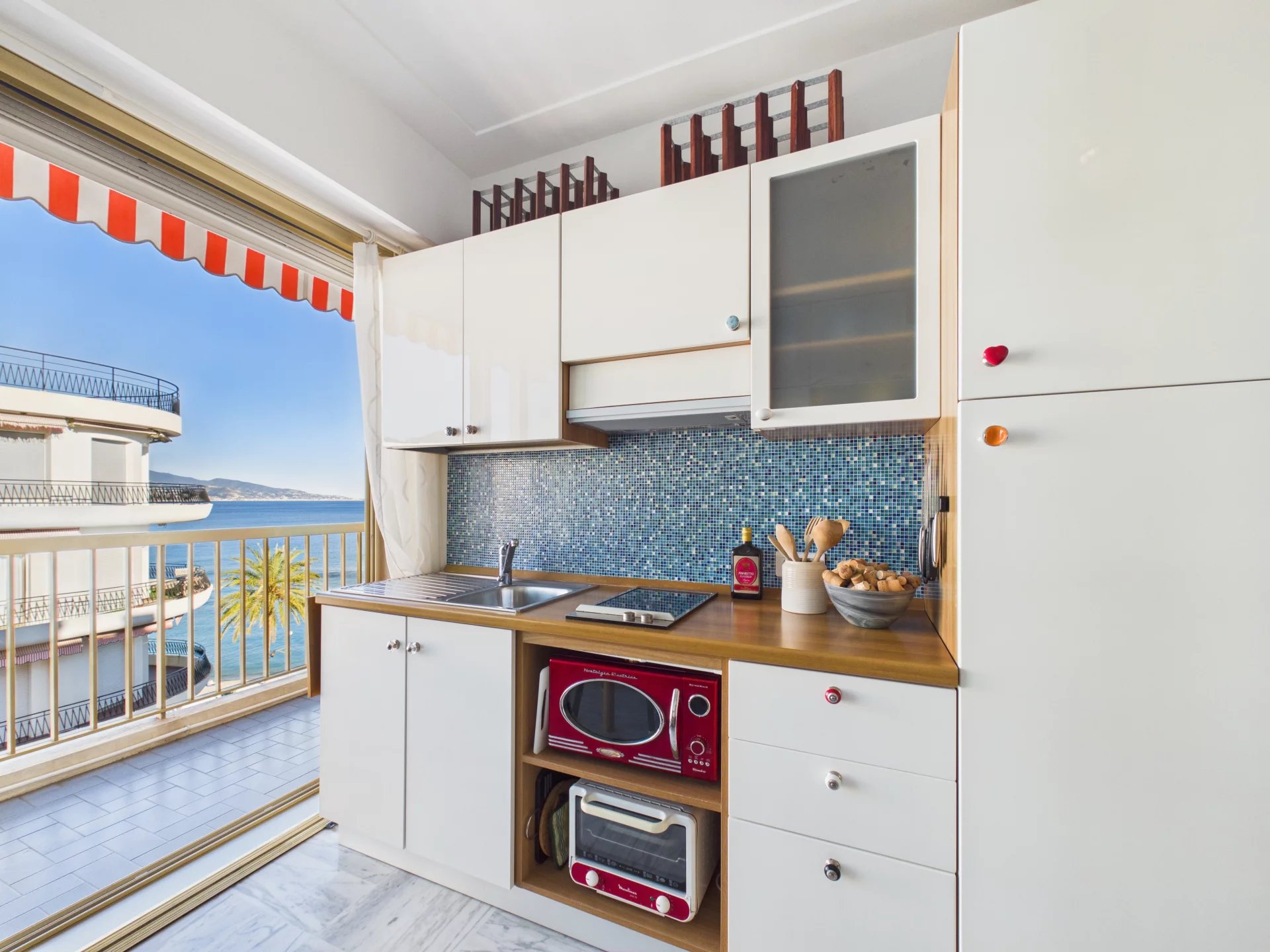 Lejligheden åbner ud mod en entré, der fører til et brusebadeværelse med toilet, derefter til en lys stue med åbent køkken, der udvides med en stor sideterrasse ud mod havet.