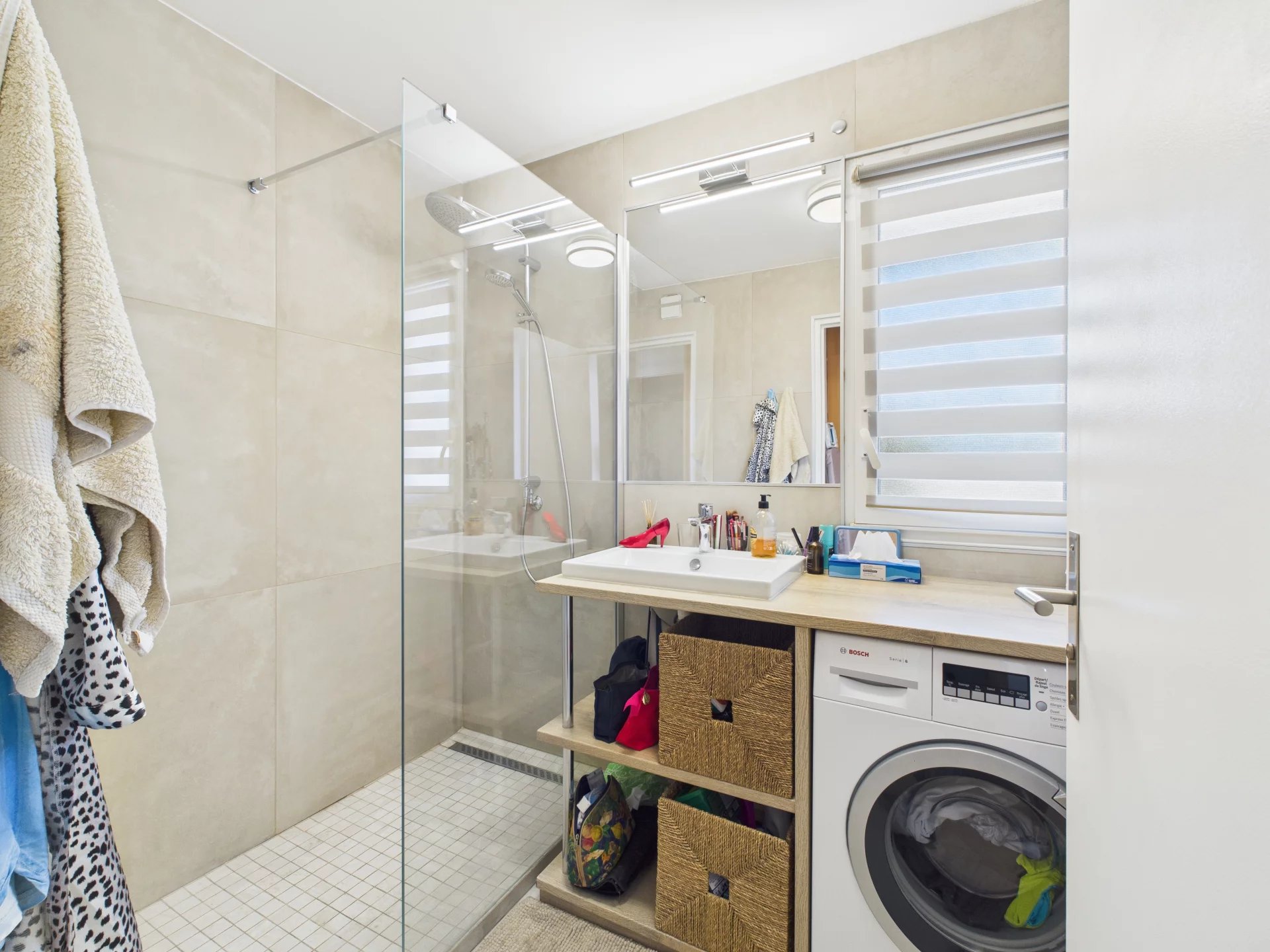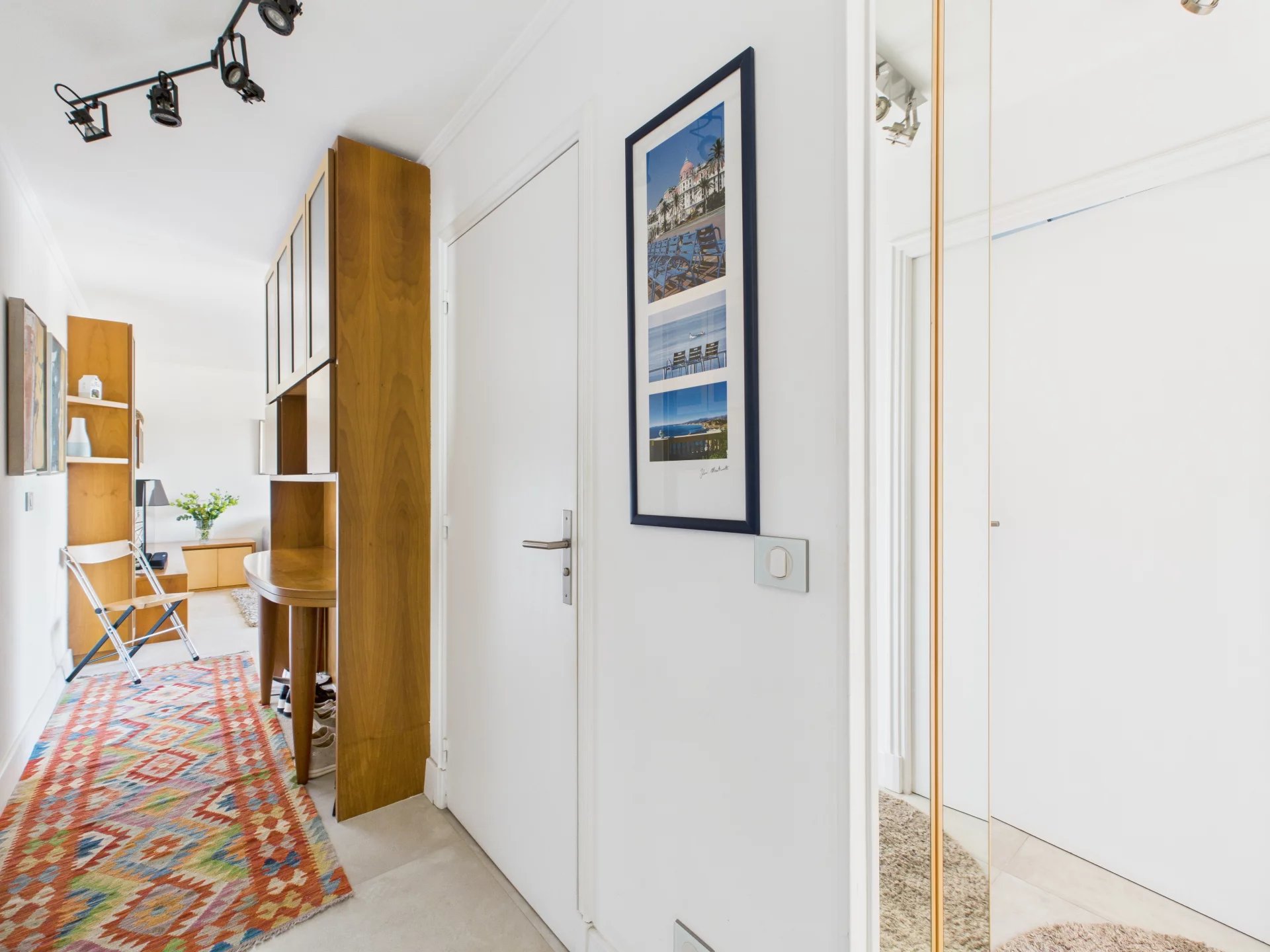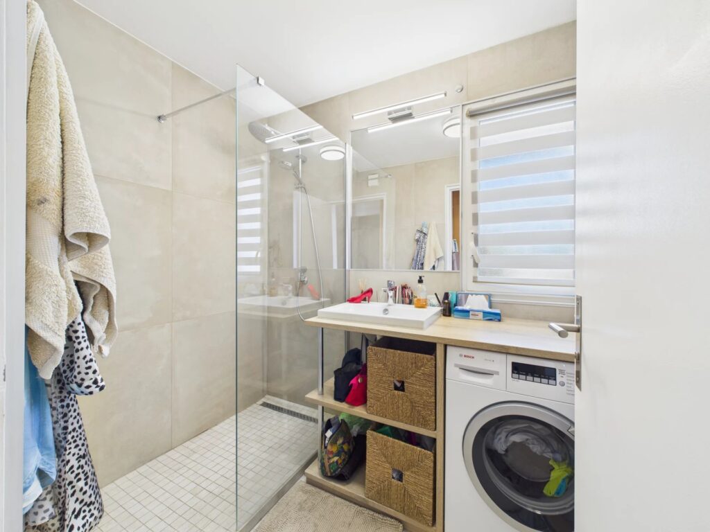 Lejligheden har også et charmerende soveværelse med rigelig opbevaringsplads og egen privat adgang til terrassen, et moderne badeværelse med bruseniche og et separat toilet. Komfort er sikret året rundt takket være aircondition overalt og termoruder.