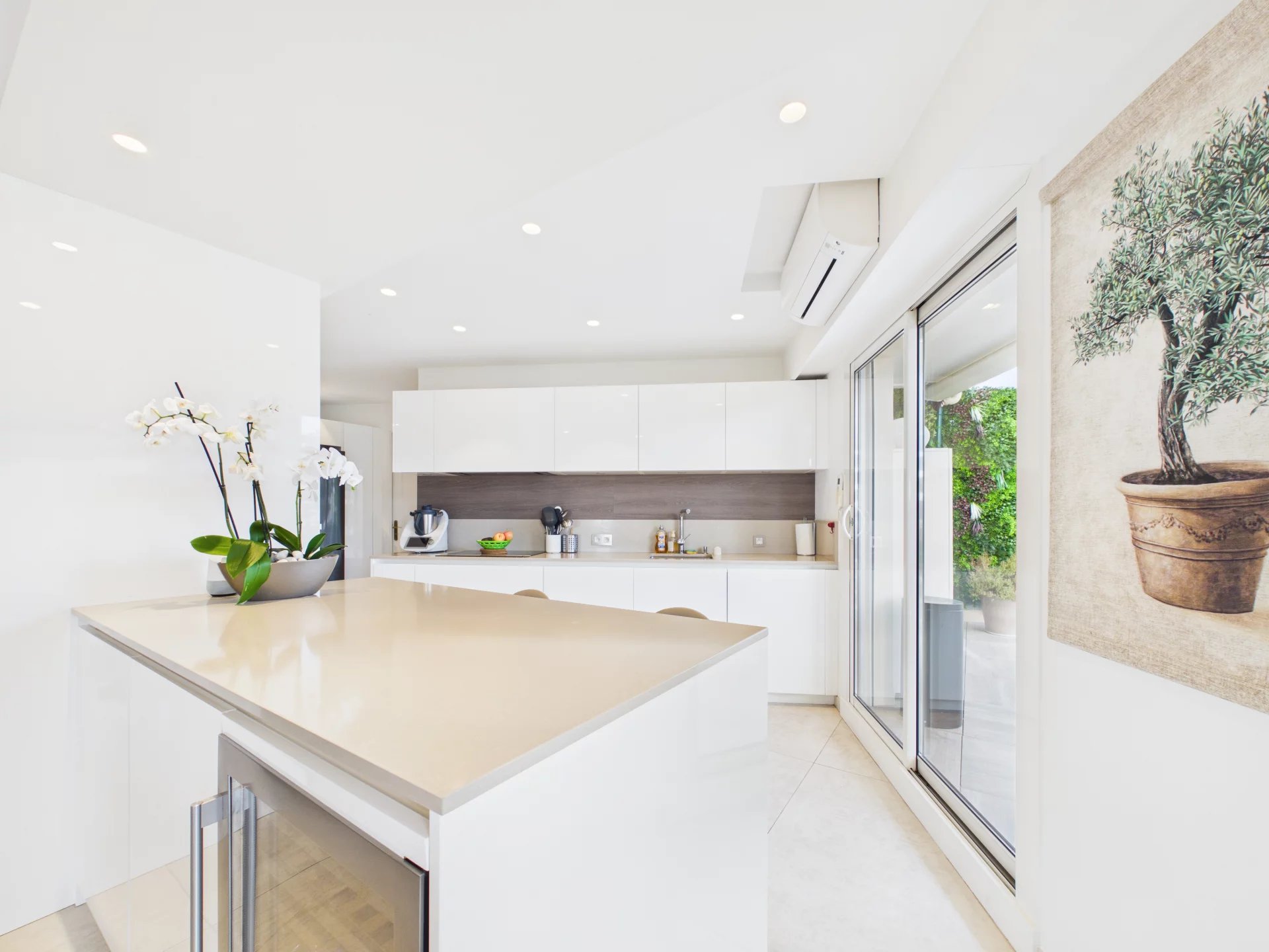 En 140 m² terrasse løber langs hele lejligheden og tilbyder uhindret udsigt over Middelhavet, Lérinsøerne, Estérel-bjergene og Cannes’ hustage. Fra terrassen fører en privat trappe op til en 120 m² tagterrasse med en middelhavshave og jacuzzi – perfekt til afslapning, mens man nyder panoramaudsigten.