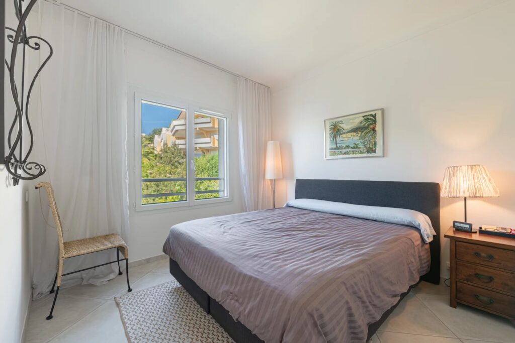 Den har en entré med et stort skab, en rummelig stue, der åbner ud til en fantastisk 12 m² sydvendt terrasse med en panoramisk og betagende udsigt over havet og Lérins-øerne.