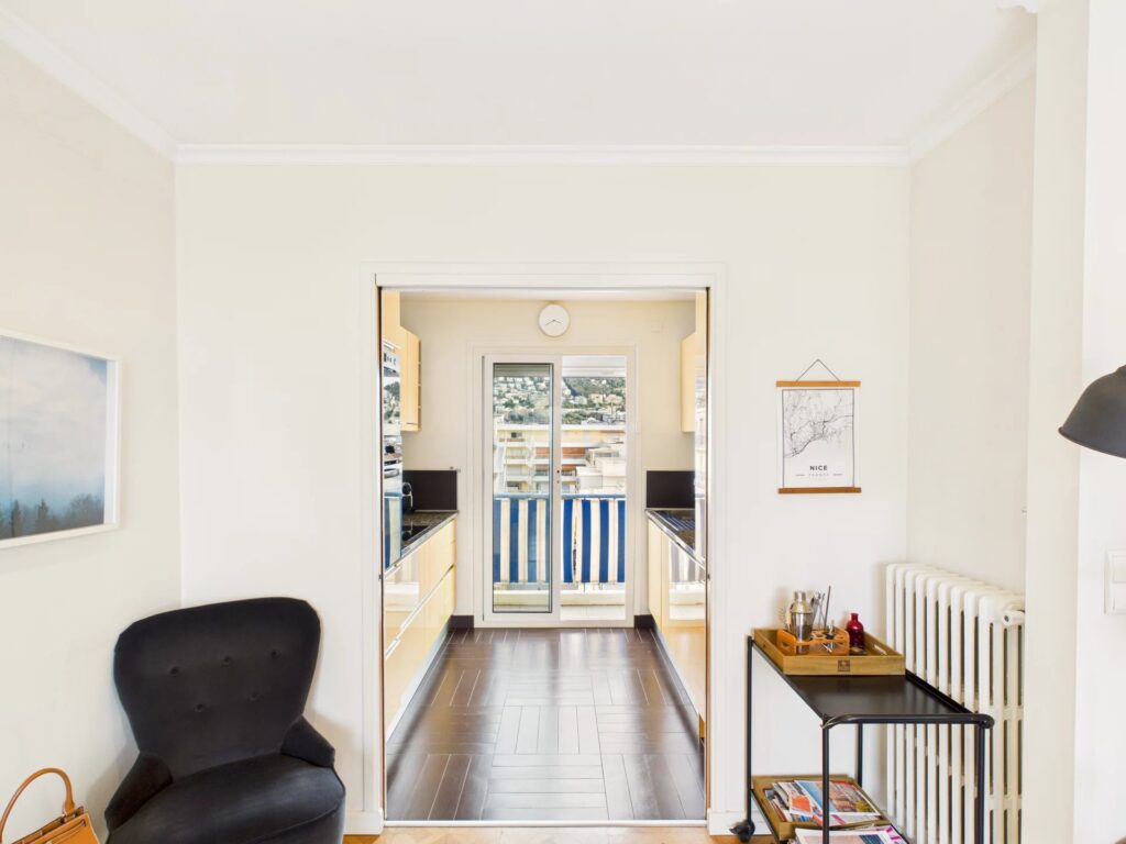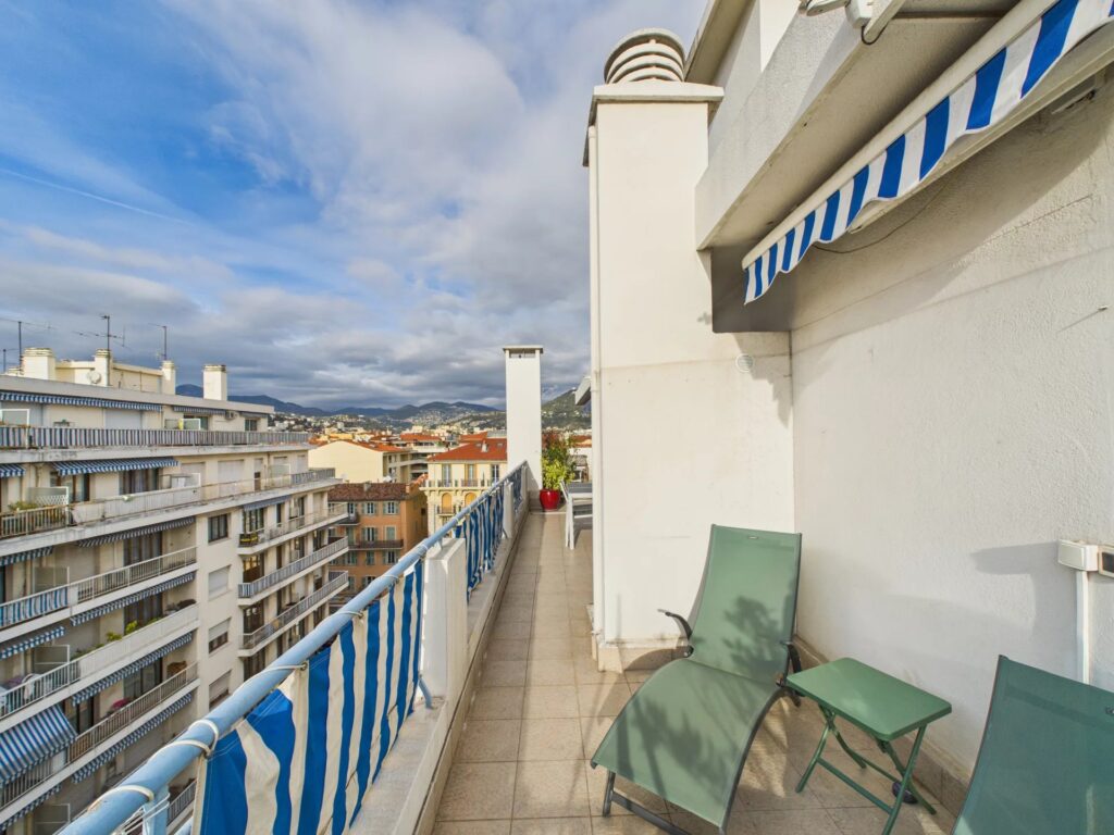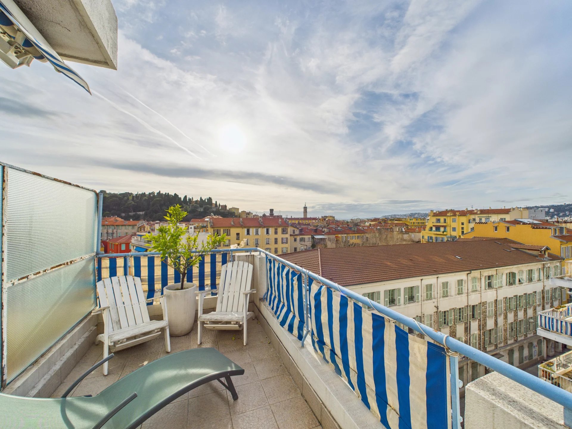 Lejligheden ligger på 7. og øverste etage i en ejendom fra 1950’erne og har en stor stue fyldt med lys og solskin takket være dens fremragende beliggenhed. Det fuldt udstyrede, halvåbne køkken udvider opholdsrummet og giver adgang til en rummelig syd-/sydvestvendt terrasse på cirka 30 kvm. Herfra er udsigten bemærkelsesværdig: bjergene nord for Nice, Castle Hill med udsigt over den gamle bydel og i det fjerne havet samt pariserhjulet på Place Masséna.