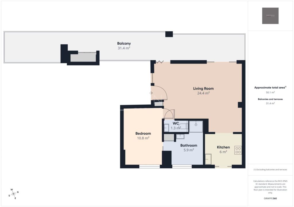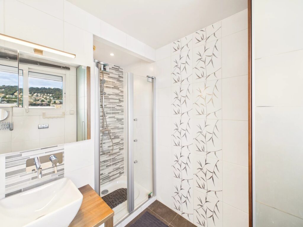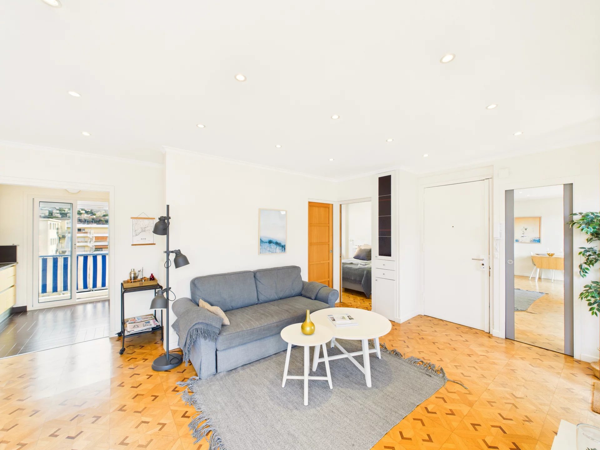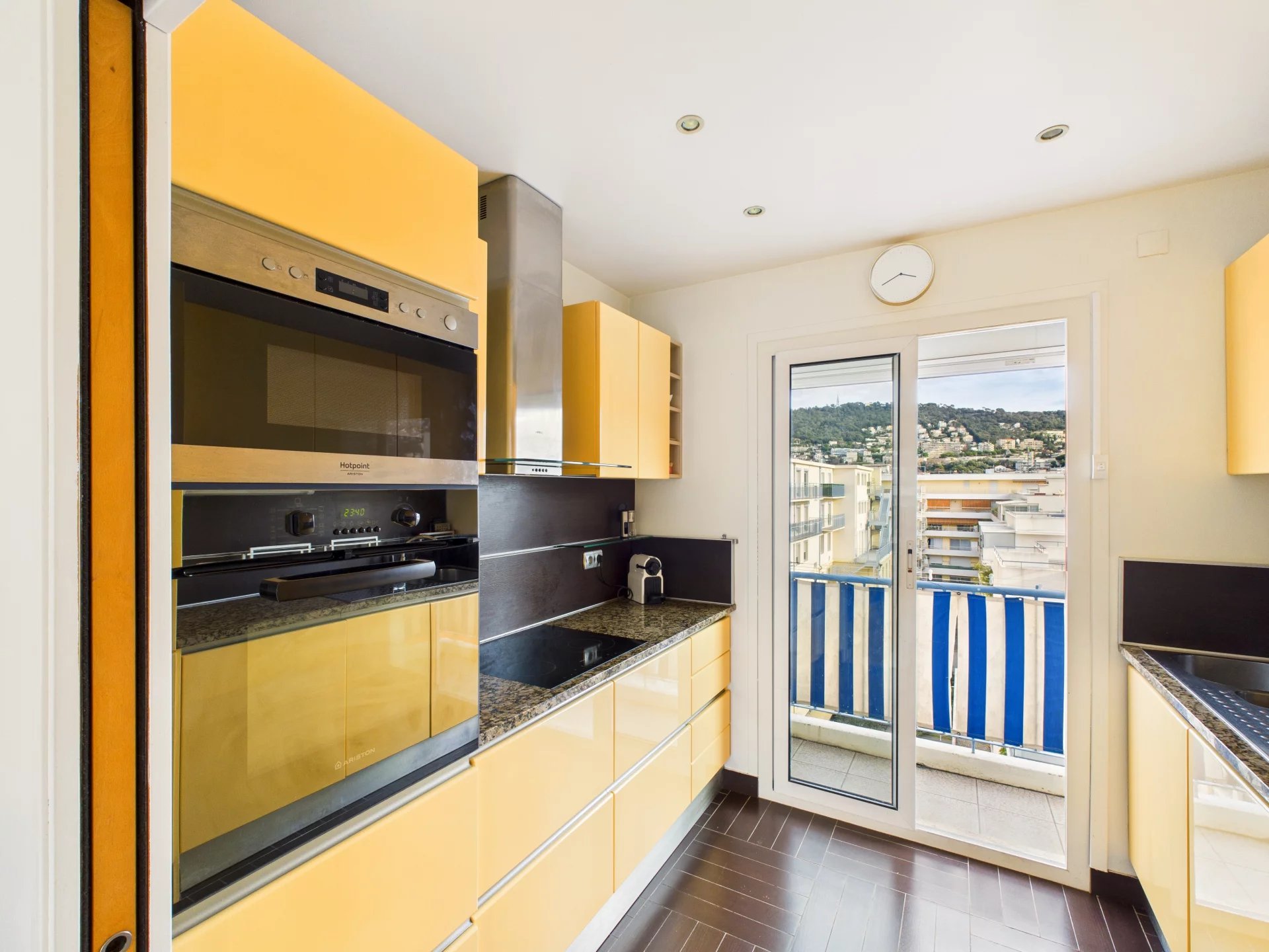 Lejligheden ligger på 7. og øverste etage i en ejendom fra 1950’erne og har en stor stue fyldt med lys og solskin takket være dens fremragende beliggenhed. Det fuldt udstyrede, halvåbne køkken udvider opholdsrummet og giver adgang til en rummelig syd-/sydvestvendt terrasse på cirka 30 kvm. Herfra er udsigten bemærkelsesværdig: bjergene nord for Nice, Castle Hill med udsigt over den gamle bydel og i det fjerne havet samt pariserhjulet på Place Masséna.